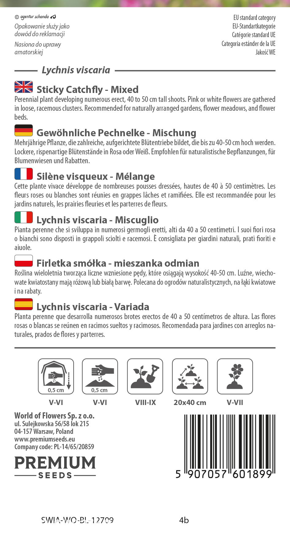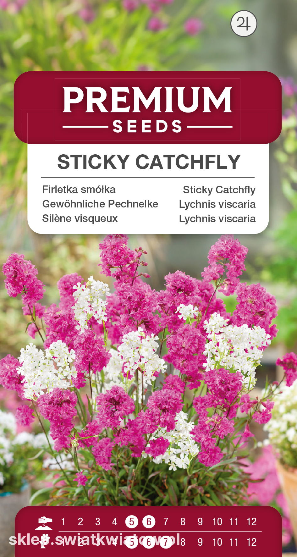 W każdej paczce znajduje się 0,3 g nasion firletki - mieszanki odmian. Opakowanie zawiera informacje o zasadach uprawy oraz o terminie przydatności do siewu.