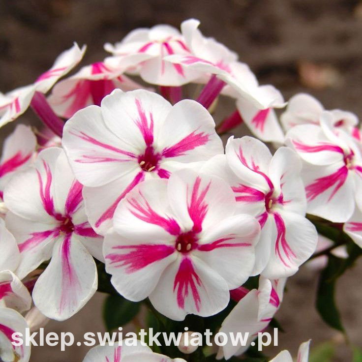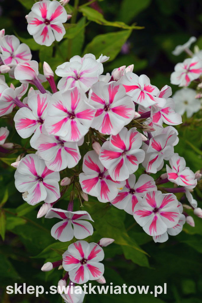 Floks – Płomyk wiechowaty – Twister (Phlox paniculata) jest nadzwyczajną odmianą gatunku popularnego od lat. Twister udowadnia, że floksy, kojarzone z wiejskimi rabatami, wyglądają urzekająco nie tylko w aranżacjach rustykalnych. Jego proste, mierzące po 60-80 cm pędy, porośnięte na całej długości lancetowatymi liśćmi, w drugiej połowie lata są przystrojone wiechowatymi kwiatostanami. Składają się na nie płaskie, pięciopłatkowe kwiaty barwy czysto białej z efektownymi, ciemnoróżowymi paseczkami ułożonymi w taki sposób, że każdy okaz wygląda jak odpustowy wiatraczek. Wspaniałe kwiaty prezentowanej odmiany wprowadzą powiew nowości do każdej kompozycji bylinowej, pięknie wyglądać będą także z popularnymi, długo kwitnącymi roślinami jednorocznymi, m.in. białymi, różowymi oraz fioletowymi astrami, lwią paszczą czy werbeną ogrodową.