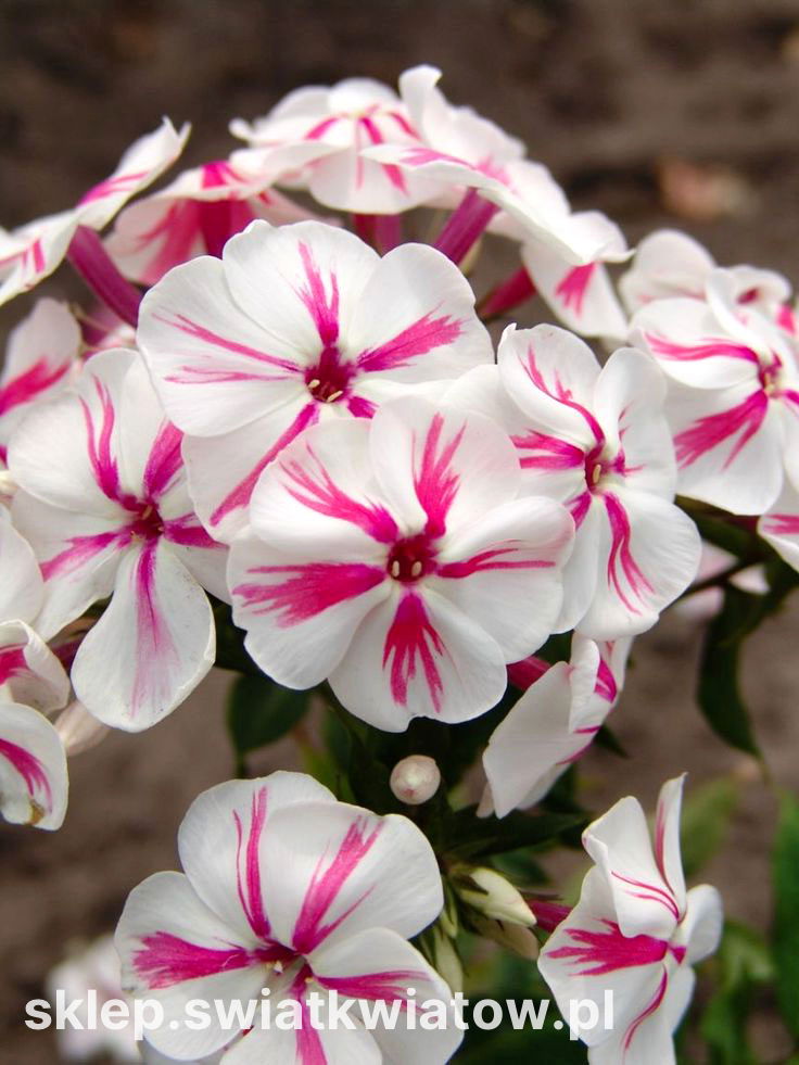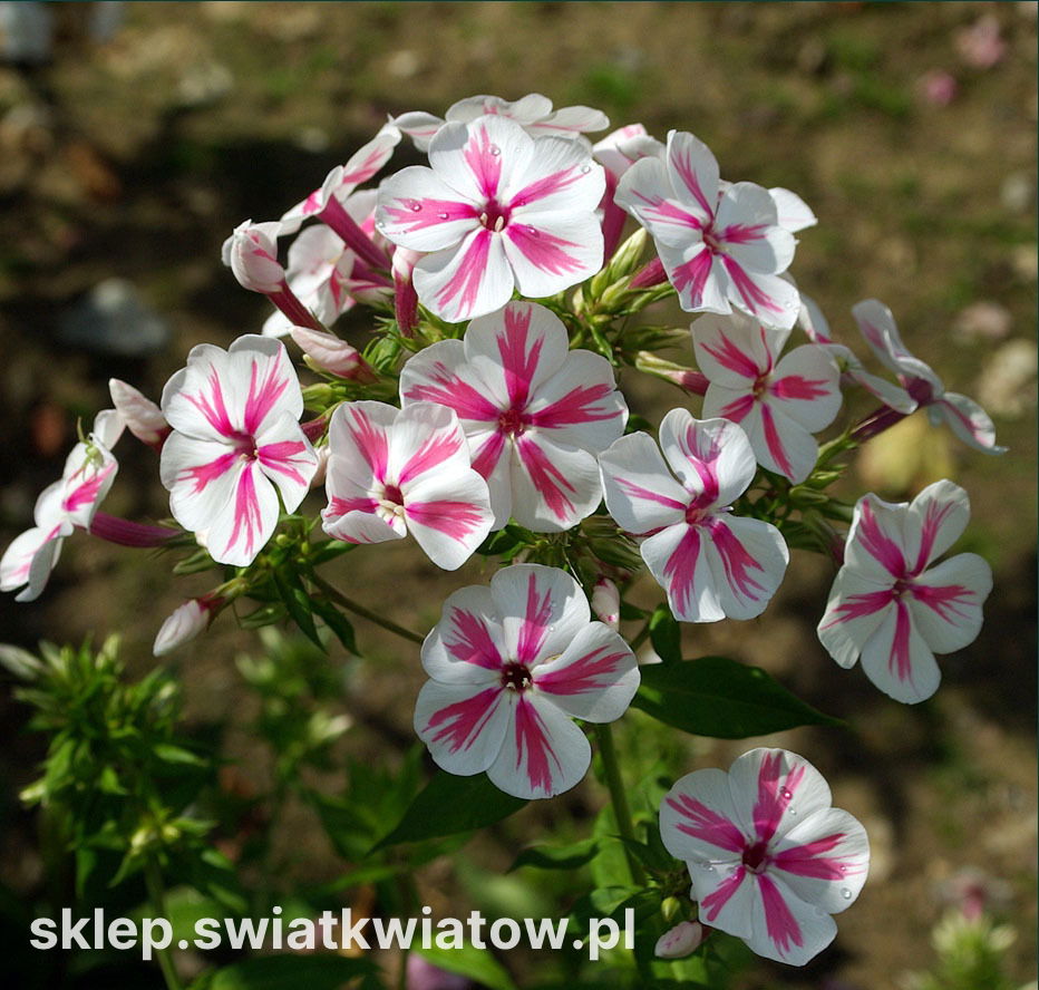 Floks – Płomyk wiechowaty – Twister (Phlox paniculata) jest nadzwyczajną odmianą gatunku popularnego od lat. Twister udowadnia, że floksy, kojarzone z wiejskimi rabatami, wyglądają urzekająco nie tylko w aranżacjach rustykalnych. Jego proste, mierzące po 60-80 cm pędy, porośnięte na całej długości lancetowatymi liśćmi, w drugiej połowie lata są przystrojone wiechowatymi kwiatostanami. Składają się na nie płaskie, pięciopłatkowe kwiaty barwy czysto białej z efektownymi, ciemnoróżowymi paseczkami ułożonymi w taki sposób, że każdy okaz wygląda jak odpustowy wiatraczek. Wspaniałe kwiaty prezentowanej odmiany wprowadzą powiew nowości do każdej kompozycji bylinowej, pięknie wyglądać będą także z popularnymi, długo kwitnącymi roślinami jednorocznymi, m.in. białymi, różowymi oraz fioletowymi astrami, lwią paszczą czy werbeną ogrodową.