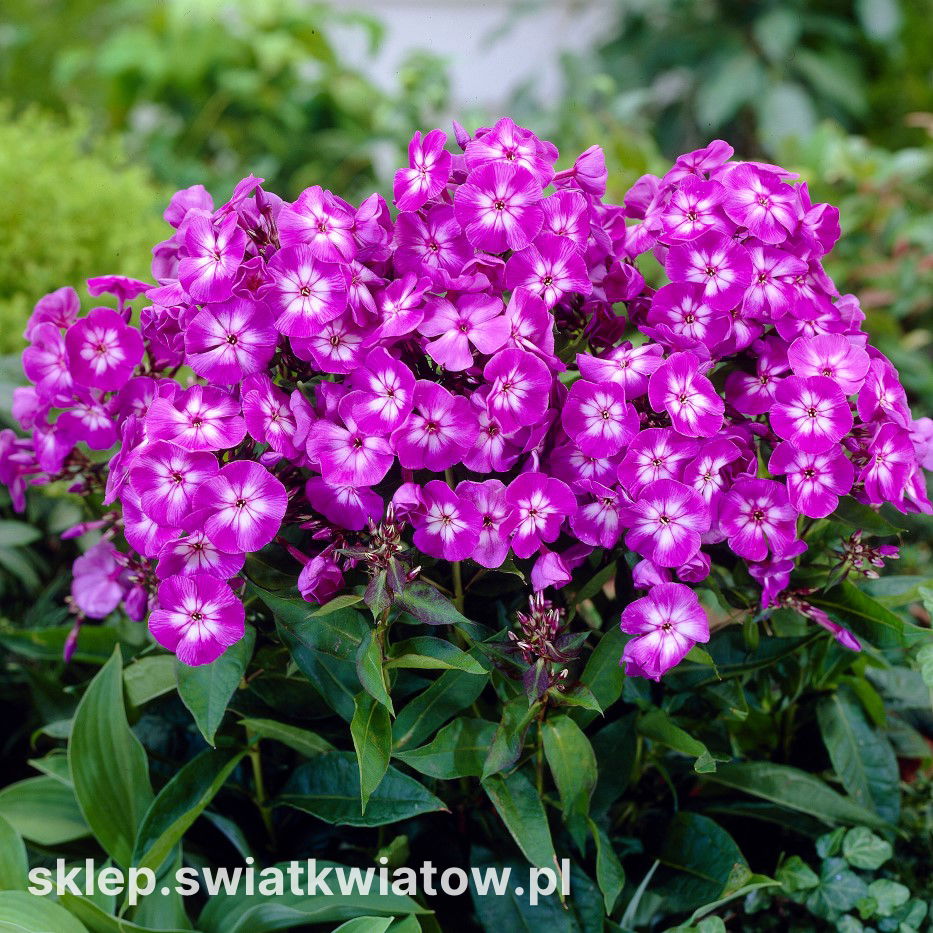Floks wiechowaty Uspech to wieloletnia roślina, która doskonale wkomponuje się w każdy ogród dzięki swoim dekoracyjnym właściwościom oraz łatwości w pielęgnacji, czyniąc ją atrakcyjną dla każdego ogrodnika. Charakteryzujący się jasnym i niezapomnianym wyglądem, z prostych łodyg i gęstych zielonych liści tworzy zwartą, kępiastą formę. Jego gęste fioletowe kwiatostany pięknie kontrastują na tle jasnej zieleni, tworząc efektowną kompozycję. Kwiatostany, składające się z wielu małych, delikatnych kwiatów o zaokrąglonych płatkach, tworzą pachnące bukiety. Szczególną uwagę przyciąga kontrastujący, jasny zarys w kształcie gwiazdy w centrum fioletowego kwiatu. Floks Uspech osiąga wysokość 40-60 cm, kwitnąc od połowy lipca do sierpnia.