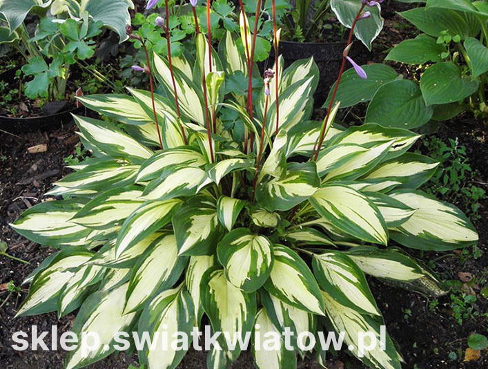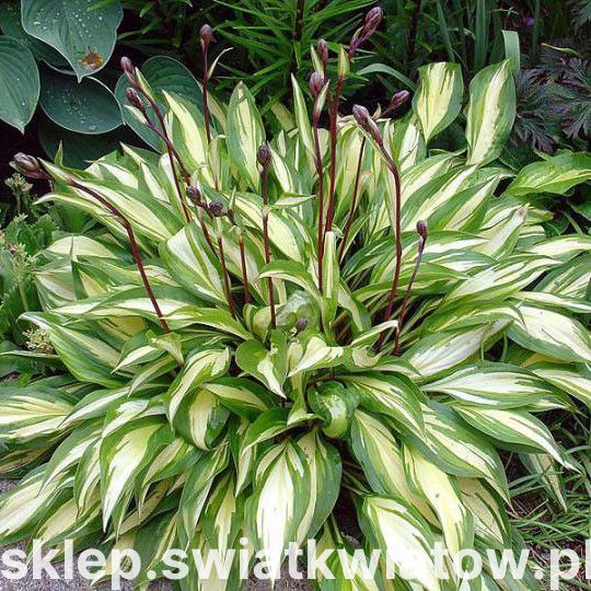 Funkia – Hosta Cherry Berry (Hosta) jest odmianą unikatową pod względem wybarwienia oraz kształtu liści. Dorasta przeciętnie do 40-50 cm wysokości, ma zwarty, bardzo ładny pokrój i liście wyjątkowo smukłe, długie, zaostrzone na końcach. Jej blaszki liściowe są intensywnie zielone z rozwidlającymi się, kremowobiałymi smugami, biegnącymi przez środek każdego liścia. Oferowana bylina wygląda szczególnie czarująco w pełni lata – w lipcu i sierpniu – gdy zdobią ją dodatkowo liczne, cienkie, proste pędy, obwieszone drobnymi, fioletowymi dzwoneczkami.