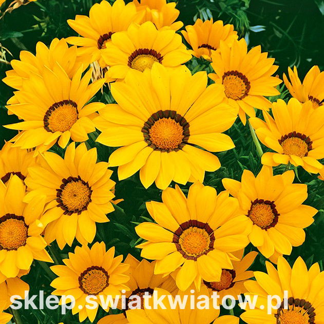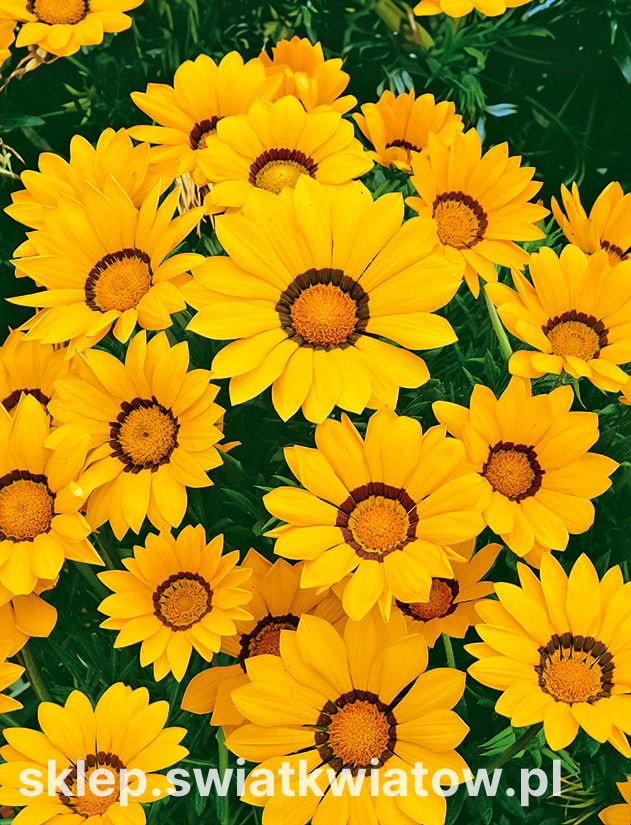 Gazania 'Yellow with Ring' to jednoroczna roślina o kompaktowym wzroście, osiągająca około 15 cm wysokości. Jej intensywnie żółte kwiaty z charakterystycznym ciemnym pierścieniem wokół środka przyciągają uwagę i dodają ogrodowi dynamicznego charakteru. Kwiaty gazanii otwierają się szeroko w pełnym słońcu, natomiast w pochmurne dni zamykają się, co nadaje jej wyjątkowego uroku i czyni z niej niebanalną ozdobę każdego ogrodu.
