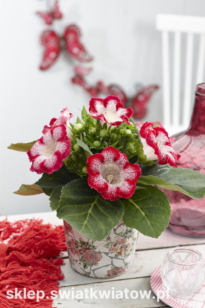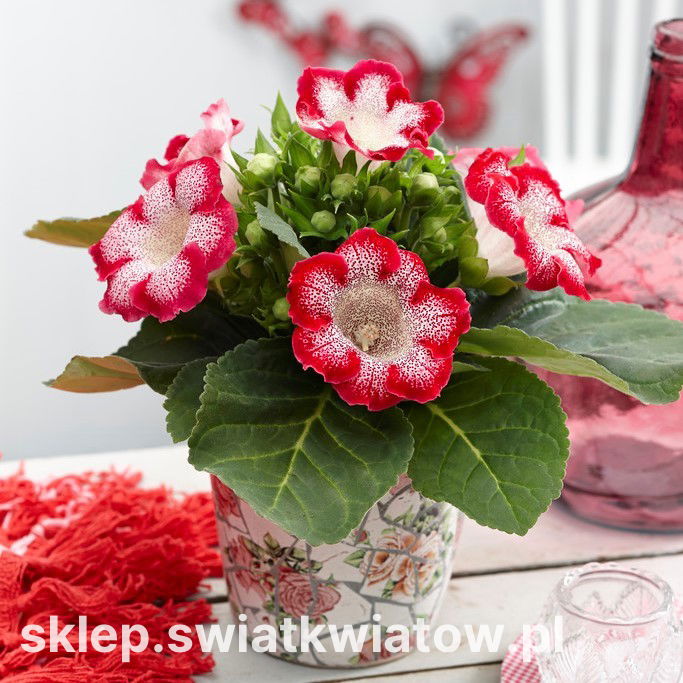 Gloksynia Tigrinia Red to łatwa w uprawie roślina o bardzo efektownych nakrapianych kwiatach. Ta niezbyt okazała odmiana , osiągająca 20-30 cm wysokości. Duże kwiaty rozwijają się nad kępą pokrytych delikatnymi włoskami liści. Są aksamitne i przypominają kielichy, mają biało-czerwoną barwę. Gloksynie sadzi się głównie w doniczkach w pomieszczeniach lub ogrodach zimowych. Odmiana Tigrinia Red ceniona jest za długie i obfite kwitnienie, będzie wspaniałą ozdobą każdego wnętrza, choć można ją posadzić w donicach dekorujących balkon lub taras.