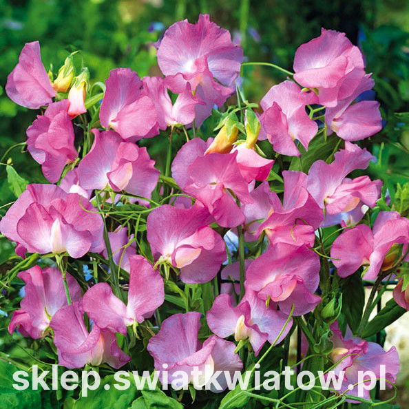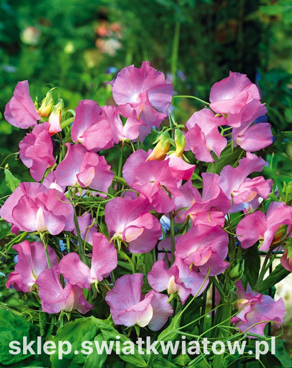 Groszek pachnący 'Gwendoline' to efektowna, jednoroczna roślina pnąca, która zachwyca swoimi delikatnymi kwiatami w odcieniach różu i bieli. Jej subtelne różowe płatki, które łagodnie przechodzą w biel, nadają kwiatom romantyczny i elegancki charakter. Roślina osiąga wysokość do 250 cm, dzięki czemu znakomicie nadaje się do dekoracji pionowych powierzchni, takich jak pergole, ogrodzenia, kratki czy ściany.