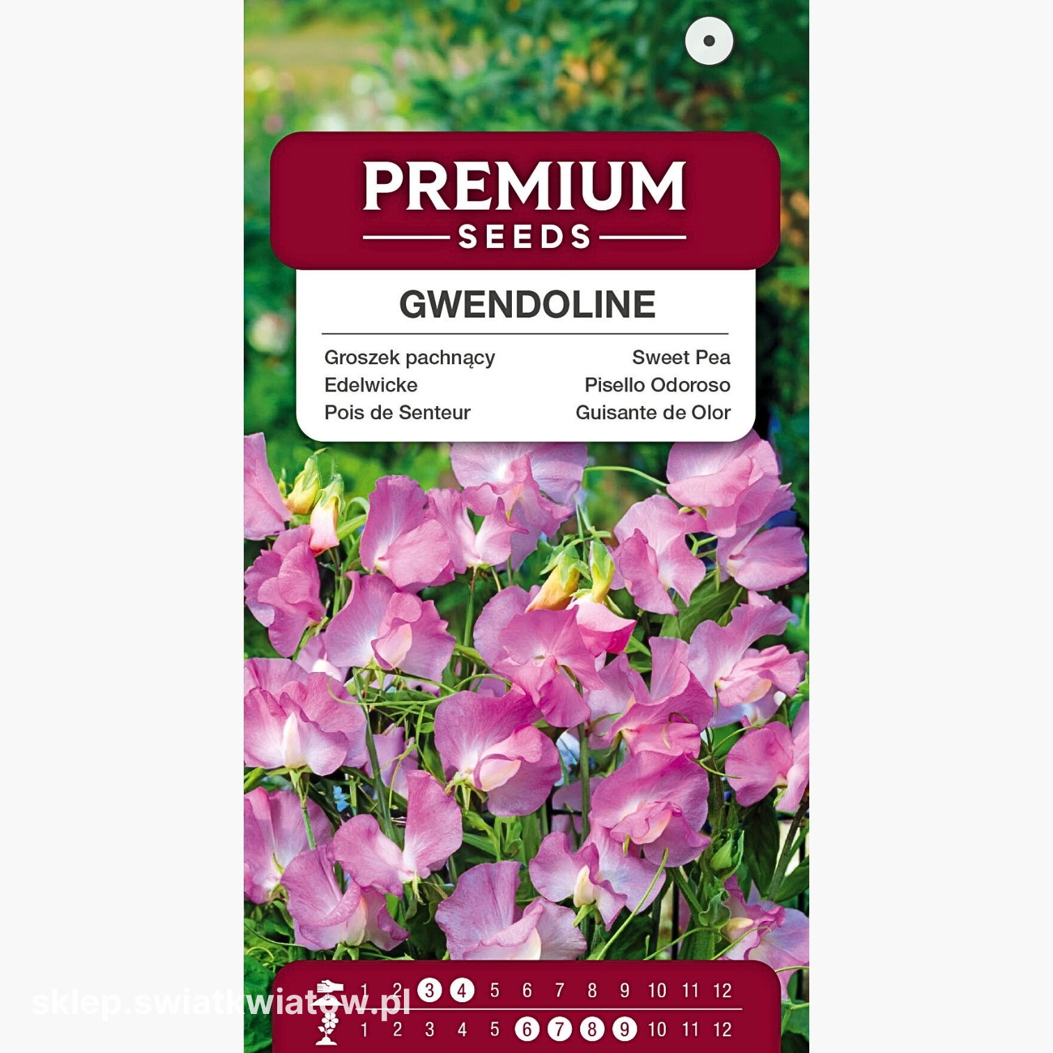 Obfite kwitnienie groszku pachnącego 'Gwendoline' trwa od czerwca do września, a jego intensywny, przyjemny zapach przyciąga uwagę i wprowadza niepowtarzalny urok do każdej przestrzeni. Kwiaty są również doskonałe na kwiat cięty – zachowują świeżość w wazonach przez długi czas, co czyni je doskonałym wyborem do tworzenia letnich bukietów i kompozycji florystycznych.