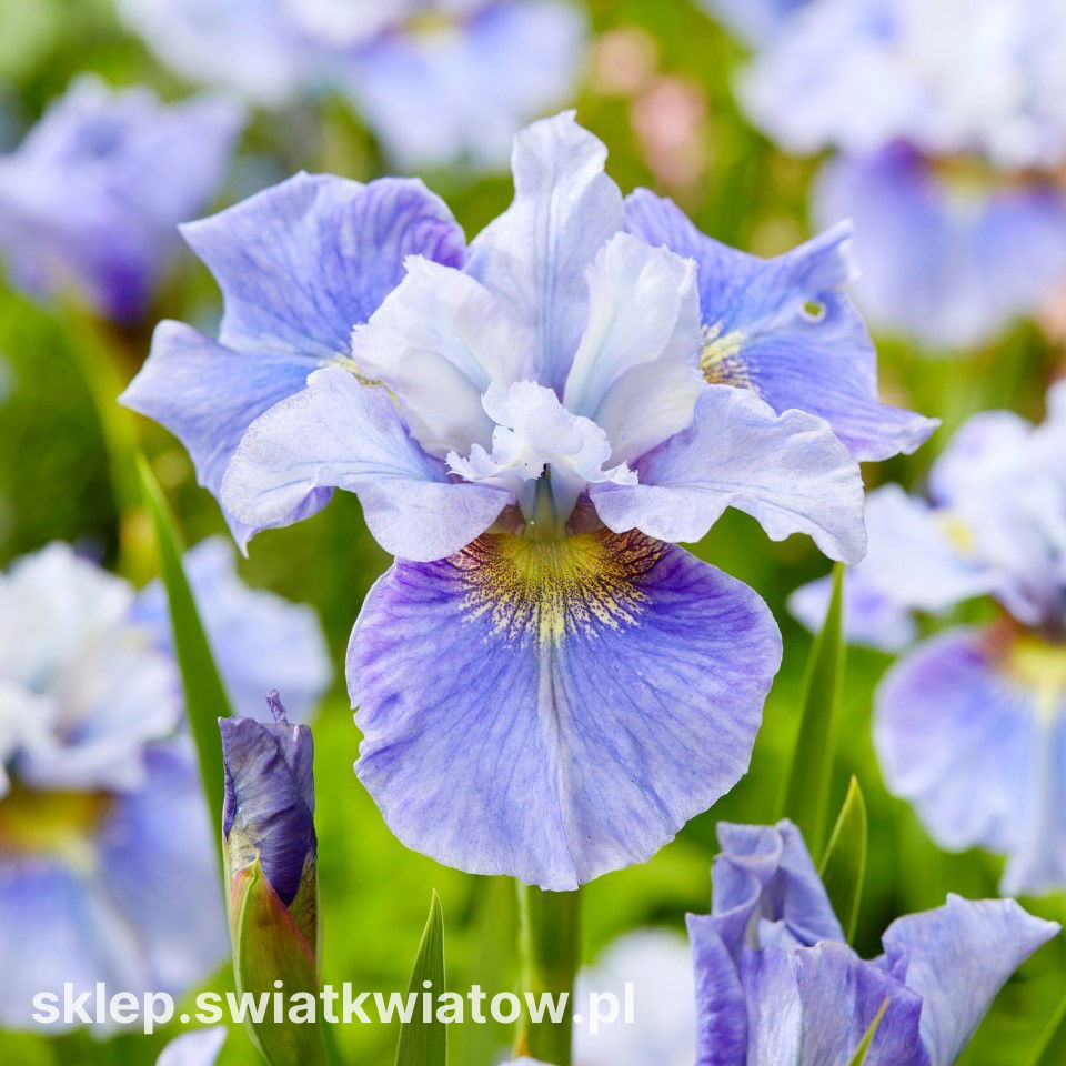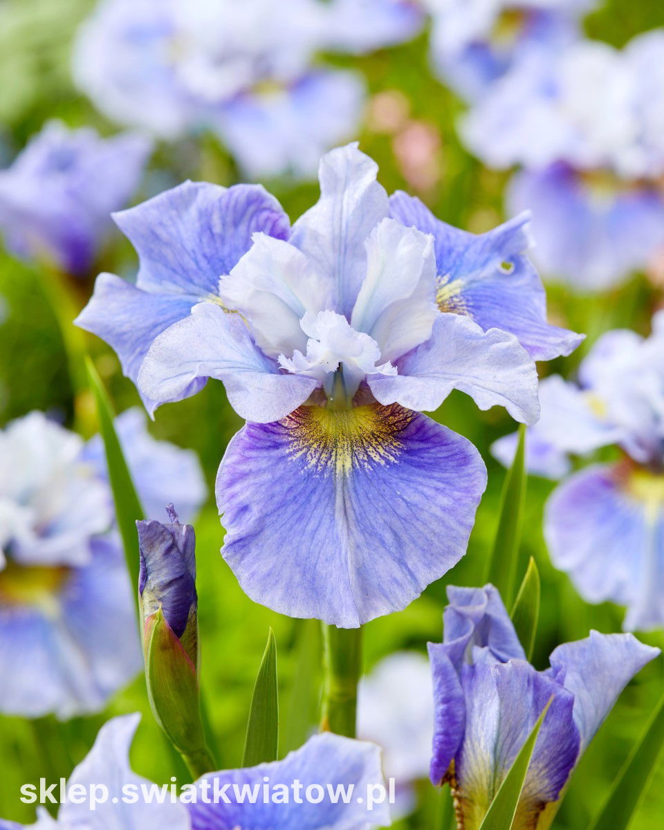 Irys syberyjski Mission Bay o uroczych błękitnych kwiatach z małą jasnożółtą plamką, przypomina bezchmurne niebo. Uwielbiana przez motyle odmiana wyrasta w strzeliste kępy. Atrakcyjne ulistnienie irysów jest jasnozielone, składa się z wąskich i ostro zakończonych blaszek. Pod koniec wiosny lub na początku lata na kępie wyrastają okrągłe łodygi zakończone kwiatostanami. Budowa kwiatów irysów jest bardzo specyficzna, trudna do pomylenia z innym gatunkiem. Oferowana w naszym sklepie unikatowa odmiana osiąga ok. 70 cm wysokości, a pełnia kwitnienia przypada na maj i czerwiec. Efektowne, dekoracyjne z kwiatów i liści kosaćce to ciekawy materiał do sadzenia na rabatach bylinowych utrzymanych w stylu naturalistycznym czy rustykalnym. Zwarte kępy prezentują się wprost fenomenalnie w otoczeniu strumyków, oczek i sadzawek. Kwiaty irysów syberyjskich nadają się na bukiety, ale nie są wybitnie trwałe.