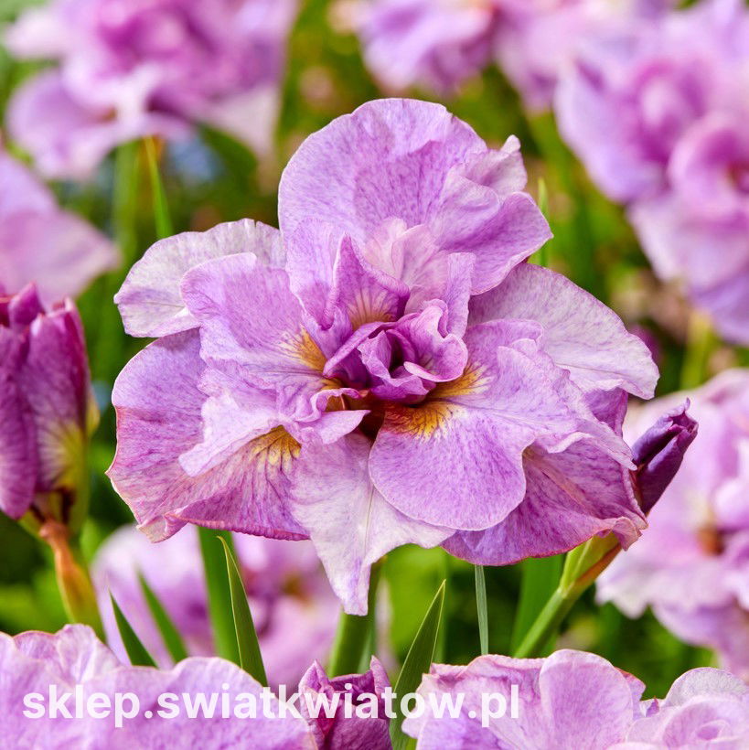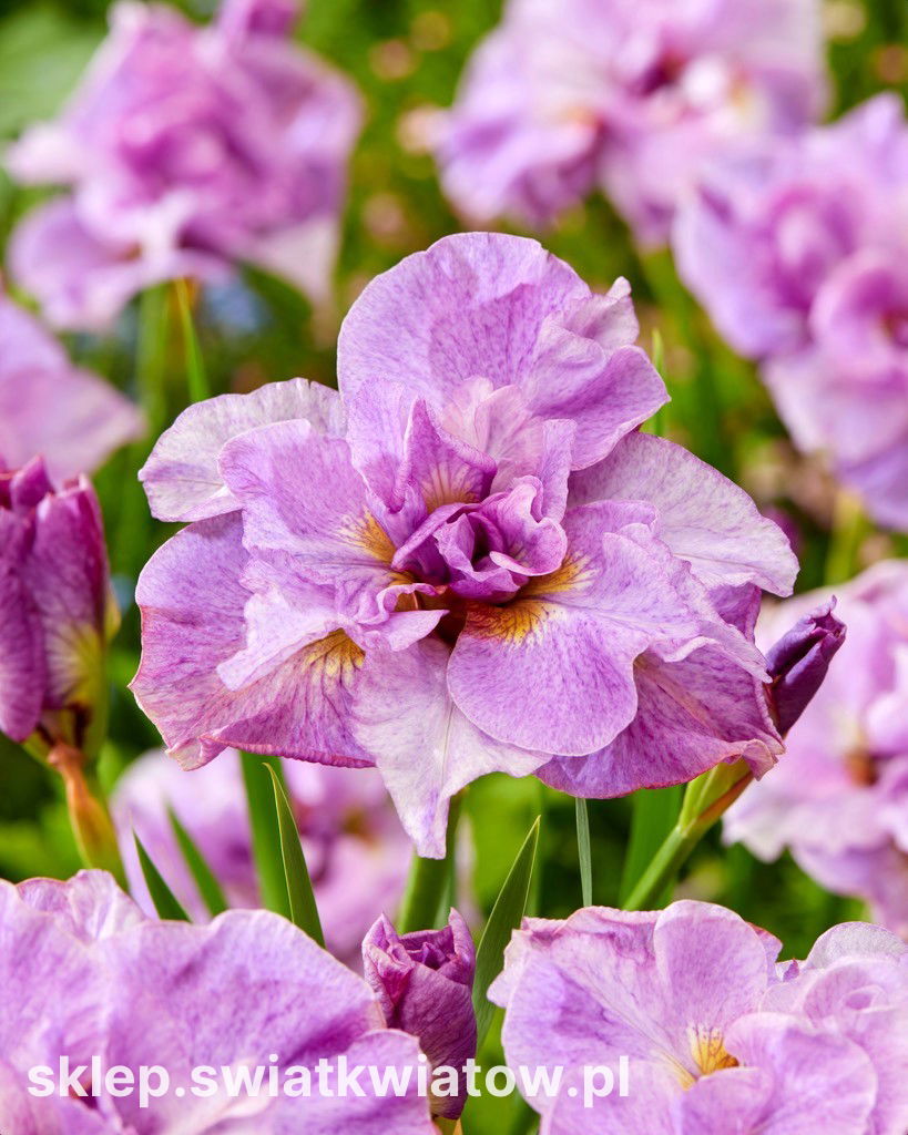 Kosaciec syberyjski Pink Parfait jest niezwykle szykowną odmianą. Okazałe, pełne kwiaty o jasnej lawendowej barwie z delikatnym różowym podbiciem rozkwitają w maju. Ich miękko układające się płatki zaakcentowane są przez biało-żółte plamki pokryte ciemniejszymi żyłkami. Pink Parfait jest średniej wielkości rośliną, której wysokość nie przekracza 70 cm. Irysy są dekoracyjne nie tylko z kwiatów. Za wartościowe uznawane są również kępy szablastych liści o nasyconym jasnozielonym kolorze. Dostępna w naszym sklepie odmiana to propozycja na rabaty bylinowe, pojemniki i do obsadzania ogrodowych zbiorników wodnych. Urzekające kwiaty komponują się z roślinami cebulowymi, ładnie prezentują się w towarzystwie orlików, leśnych zawilców czy wysokich kuklików. Odmiana o pełnych kwiatach jest niepowtarzalna i doda wiele uroku każdej aranżacji.