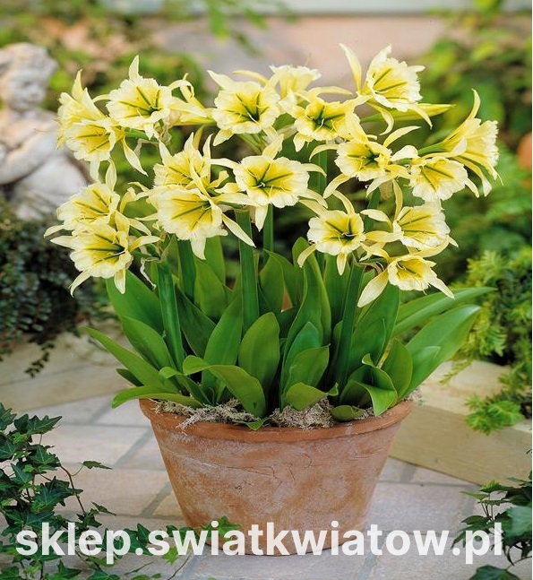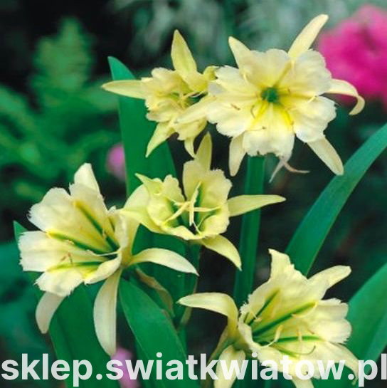 Ismena Sulphur Queen – Błonczatka (Hymenocallis) to propozycja dla ogrodników o wyrafinowanym guście, rozmiłowanych w roślinach egzotycznych. Ta piękna, kwitnąca w pełni lata bylina zachwyca przede wszystkim swoimi wdzięcznymi kwiatami w formie głębokich kielichów. Przykoronek każdego z nich jest delikatnie postrzępiony i otoczony sześcioma wstęgowatymi płatkami. Kwiaty odmiany Sulphur Queen przybierają elegancki jasnożółty kolor. Ich pastelowy czar zostaje dodatkowo uwypuklony przez intensywnie zieloną barwę prostych, długich na ok. 60 cm pędów i szablastych, stojących liści.
