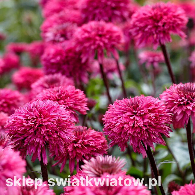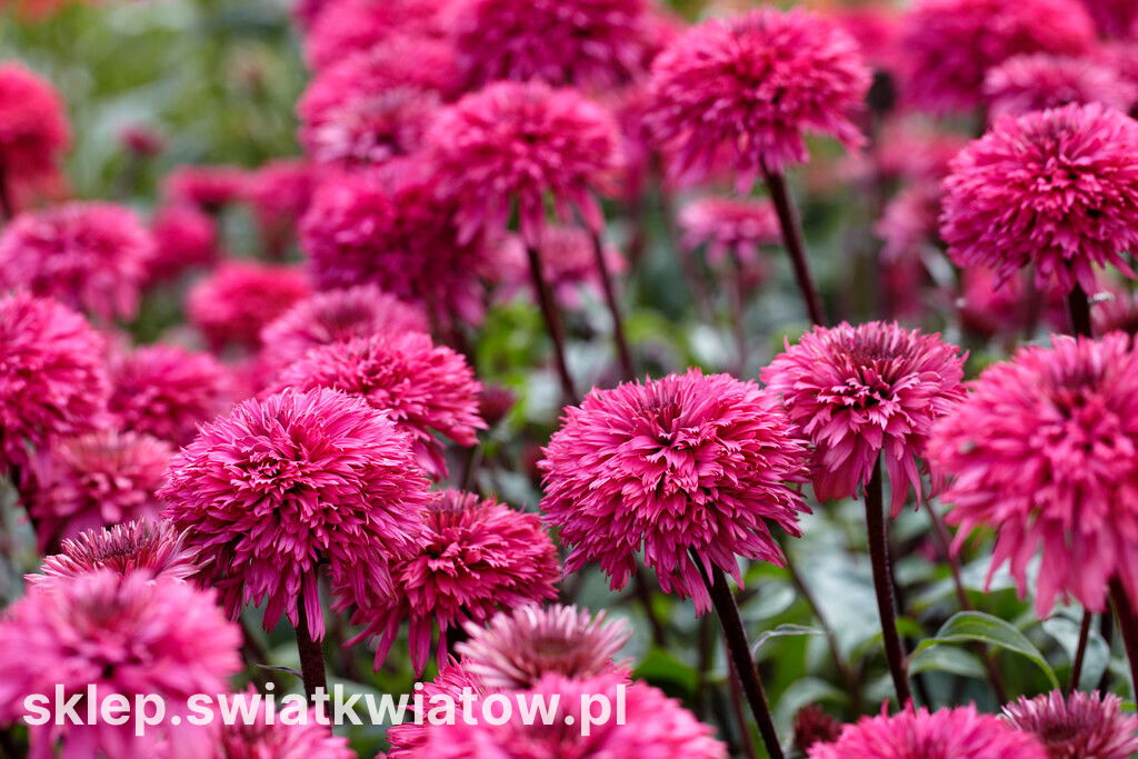 Jeżówka pełna Blackberry Truffle należy do elity swojego gatunku. Ta cudowna, licencjonowana odmiana jest ogrodniczą delicją. Puszyste kwiatostany o różowej barwie, w początkowej fazie kwitnienia mają ciemniejsze centrum, później stają się bardziej jednolite. W pełni sezonu roślina osiąga około 70-80 cm wysokości. Jeżówka Blackberry Truffle jest ceniona za długi okres kwitnienia. Od początku lata do początku jesieni, na sztywnych, szorstko owłosionych łodygach pojawiają się urocze kwiaty. Krzaczki jeżówki można zasadzić pojedynczo i w większych grupach. Barwne poletko 5-7 sztuk na metrze kwadratowym prezentuje się imponująco. Jesienna rabata, na której zagości ten nadzwyczajny kwiat, co roku będzie wyjątkową ozdobą schyłku sezonu.