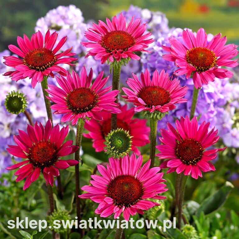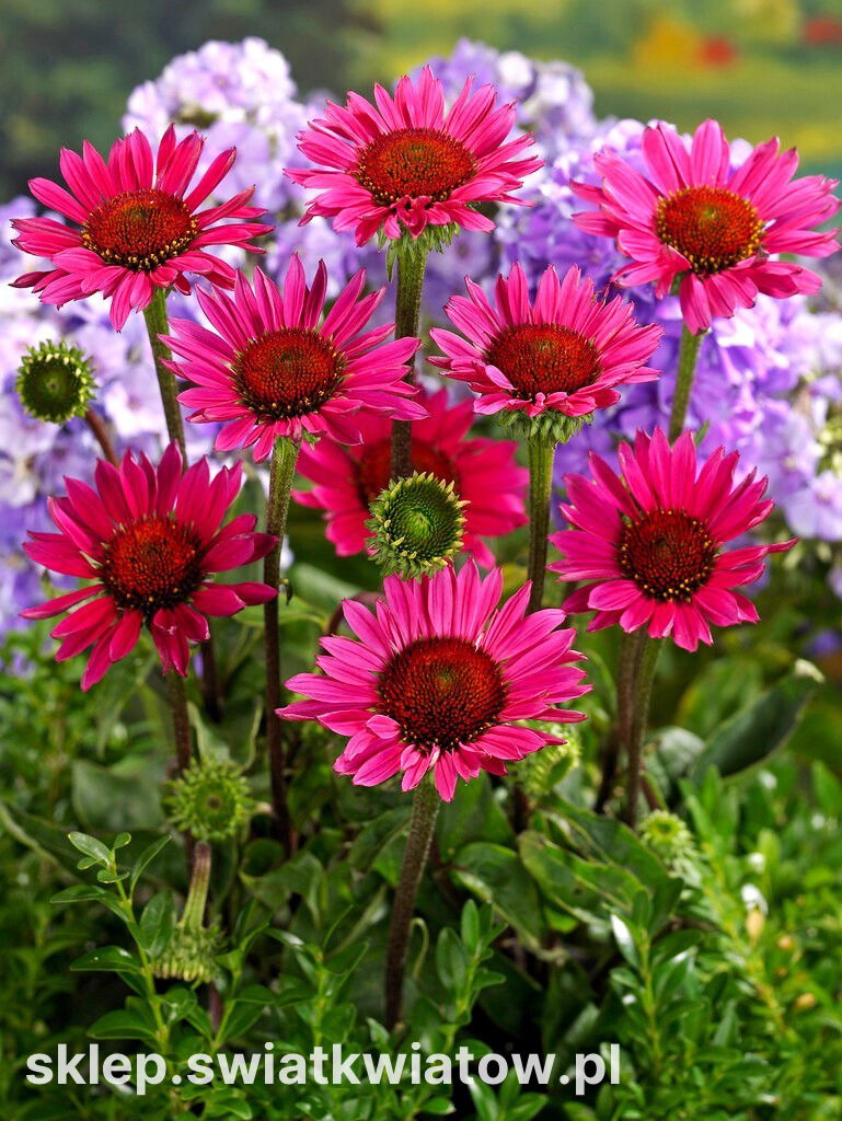 Jeżówka purpurowa jest obecnie uważana za klasyczną bylinę ogrodową. W naszym sklepie oferujemy zjawiskową odmianę Vintage Wine. Jest to piękna, dekoracyjna roślina o dużych, promienistych koszyczkach kwiatowych w kolorze szlachetnej purpury. Sztywne, mało rozgałęziające się pędy dorastają do 60 cm wysokości. Od czerwca do września roślina zachwyca mnóstwem kwiatów w formie małych spodeczków. Kolczaste środki, od których wywodzi się nazwa rośliny, otacza kryza krótkich, sztywnych płatków w wyrazistym kolorze. Niezwykłej urody jeżówka ma niewielkie wymagania, dlatego można ją zastosować w wielu kompozycjach. Można ją uprawiać na rabatach i kwietnikach bylinowych, w nasadzeniach naturalistycznych, grupach na trawniku. Sztywne rośliny dają dość mocny akcent wizualny, przepięknie kontrastujący z trawami ozdobnymi. Jako towarzystwo do tej odmiany polecane są złociste słoneczniki, fioletowe szałwie lub smukłe liatry kłosowe.