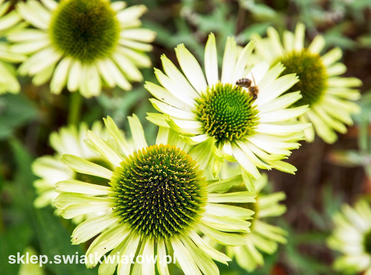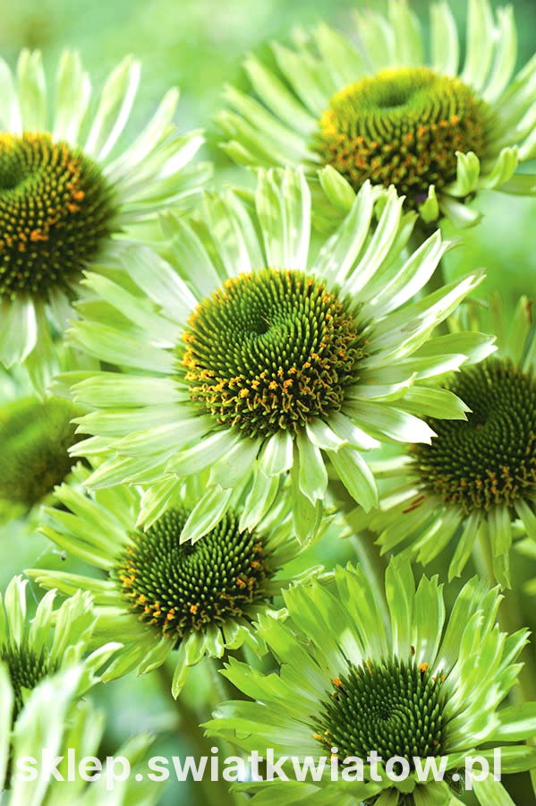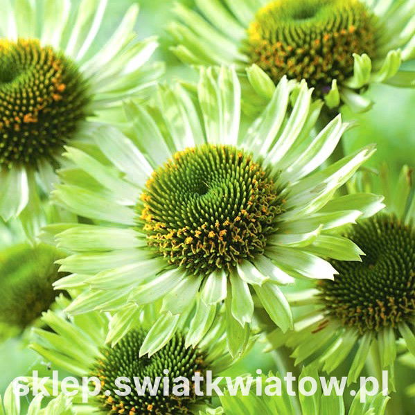 Jeżówka zielona – Green Jewel (Echinacea) to cenna, długowieczna i bezproblemowa w pielęgnacji roślina o ogromnej wartości dekoracyjnej. Nie bez przyczyny zyskała sobie miano „Zielonego Klejnotu”: w pełni lata każdy okaz wytwarza po kilka dużych koszyczków kwiatowych z okazałymi, wypukłymi, ciemnozielonymi środkami, otoczonymi promieniście przez bladozielone, krótkie i szerokie, delikatnie postrzępione płatki. Z pozoru skromne, zaskakujące nietypową urodą kwiaty wyglądają szczególnie wspaniale w dużych, gęstych skupiskach, w towarzystwie jeżówek żółtych i pomarańczowych oraz innych roślin o kwiatach w ciepłej gamie kolorów: onętków, nachyłków, dzielżanów, słoneczniczków i aksamitek. Przedstawiciele oferowanej odmiany dorastają do 90 cm wysokości, kwitną zaś od lipca do września.