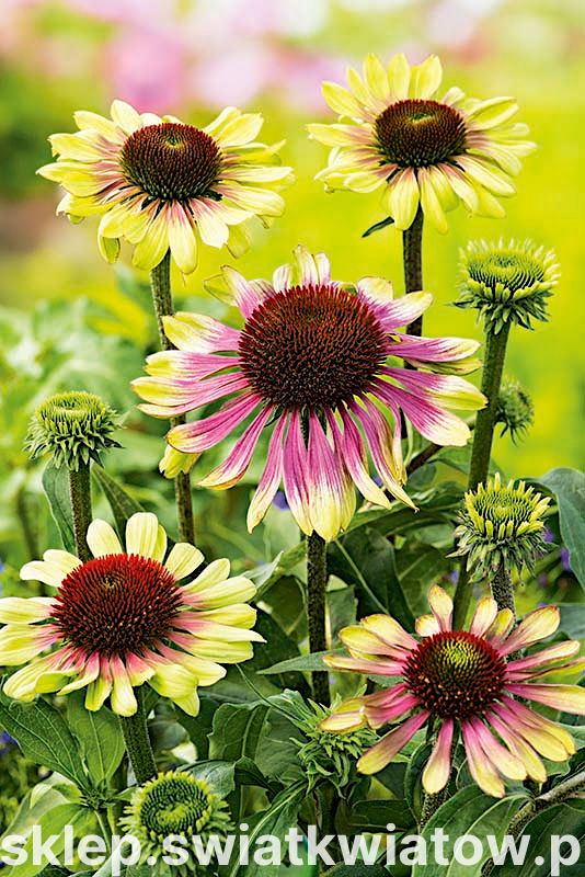 Jeżówka Green Twister to wyjątkowa odmiana przepięknej byliny. Fenomen tej rośliny polega na ciekawym wybarwieniu kwiatów. Green Twister w okresie kwitnienia ujmuje otoczenie swoimi rożowo-limonkowymi płatkami okalającymi czerwone „jeżyki” środków. Pięknie prezentująca się roślina dorasta do 70-100 cm wysokości, a kępy bujnie krzewią się na 45-50 cm szerokości. Kwiaty jeżówki można podziwiać bardzo długo. Jej kwitnienie rozciąga się od lipca do października. Spektakularne dwukolorowe koszyczki dają najintensywniejszy, niemal neonowy efekt zaraz po otwarciu, a później staj się bardziej stonowane. Jeżówka oferowanej odmiany to propozycja na rabaty, zwłaszcza te w stylu naturalistycznym i wiejskim. Tworzy fantastyczny klimat na obrzeżach kompozycji i w większych pojemnikach. Doskonale komponują się z innymi roślinami o drobniejszym i niższym pokroju. Maksymalne efekty dekoracyjne dają 3-5 roślin posadzonych obok siebie. Rośliny są atrakcyjne dla owadów zapylających, wabią roje motyli i pszczół. Nietypowe kwiaty nadają się również na wspaniałe, rustykalne bukiety.
