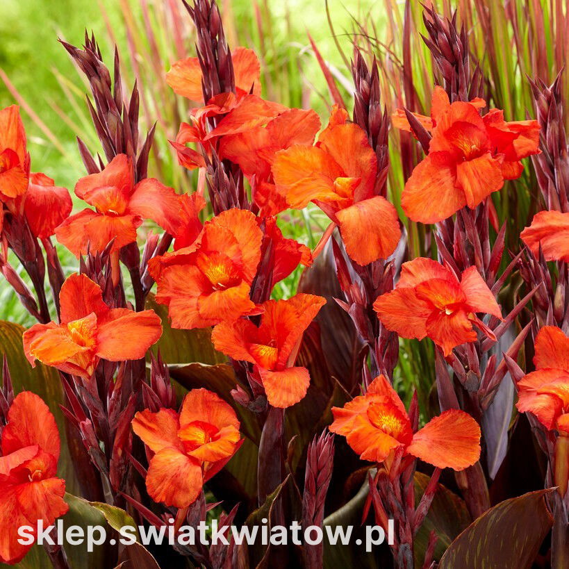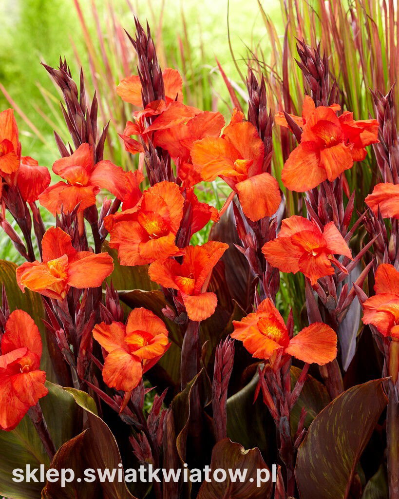 Cleopatra Red to niezwykła odmiana kanny o czerwonych kwiatach z pięknymi, ciepłymi refleksami żółci i pomarańczu. Zaletą, która uzupełnia urodę rośliny, są duże, owalne, zielone liście urozmaicone burgundem. Sztywne, wznoszące się pędy z dumą eksponują duże kwiatostany, rozwijające się na roślinie od połowy lata do wczesnej jesieni. Średniej wielkości odmiana jest idealna na brzegi rabat, większe grupy roślin i do sadzenia w pojemnikach. Wyrazisty pokrój rośliny i odważny kolor kwiatów jest znakomitym punktem równoważącym kompozycje ogrodowe. Pacioreczniki produkują nektar, który wabi liczne owady. Motyle tańczące wokół bujnych kwiatów o egzotycznym charakterze jest niesamowitym widokiem.