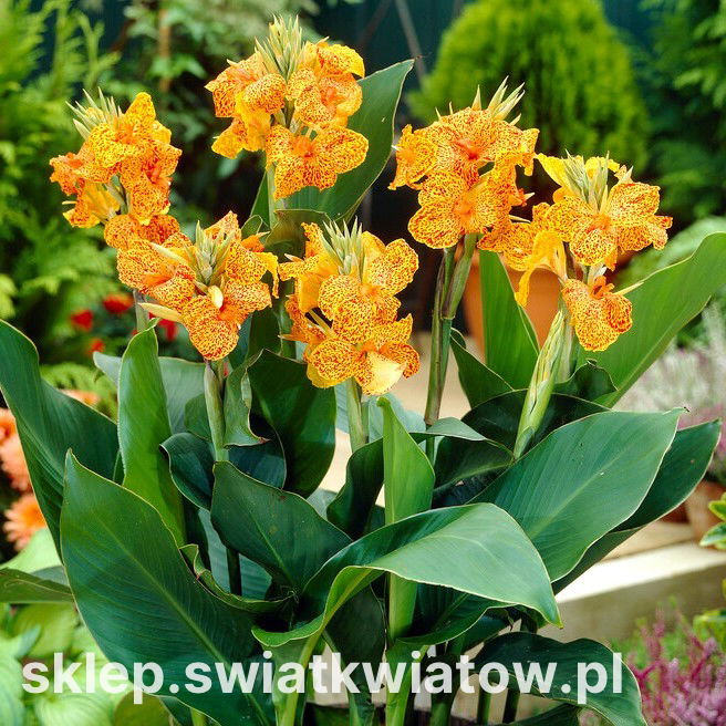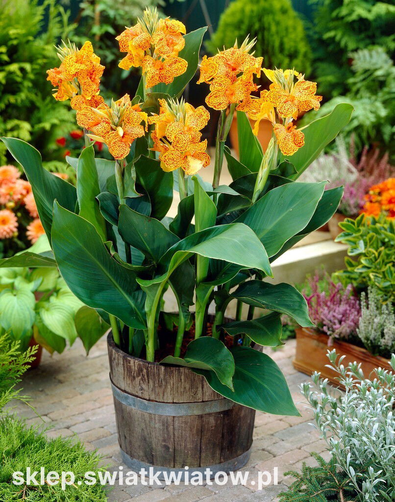 Kanna Picasso to gratka dla fanów wyraźnych form i kolorów. Urocze cytrynowożółte kwiaty są gęsto nakrapiane intensywną czerwienią. Owalne płatki lekko się wywijają, nadając roślinie śliczny, bogaty wygląd. Na wzniesionych, pustych w środku pędach, wyrastają wielkie, owalne liście o soczystej, zielonej barwie. Na ich tle wzorzyste kwiaty prezentują się wręcz obłędnie. Ten selekt kanny daje rośliny osiągające od 60 do 100 cm. Kanny są postrzegane jako element nieco egzotyczny w polskim klimacie, co jest zgodne z prawdą. Pochodzące z tropikalnych terenów pacioreczniki zdobią ogrody od lipca do pierwszych, większych chłodów. Posadzona w gruncie lub dobranej do niej wielkością i modelem donicy kanna Picasso wniesie ciepłą nutę do otoczenia. Silne z pokroju rośliny tworzą ciekawą formę, która podnosi estetykę wizualną aranżacji wielopiętrowych. Pacioreczniki można sadzić w wielu miejscach, gdzie spełnią rolę kwitnących parawanów i obramowań.