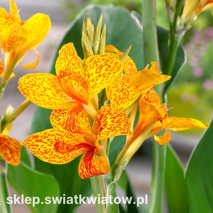 Kanna o egzotyczne nazwie Tenerife przyciąga uwagę złocistożółtymi kwiatami z pomarańczowo-czerwonymi cętkami na całej powierzchni. Ta odmiana to ogrodowy hit, wnoszący tropikalny klimat do każdej kompozycji. Tenerife jest oszałamiającym połączeniem nasyconych kolorów kwiatów i bujnej zieleni liści. Sięgające 120 cm okazy wspaniale prezentują się w pojemnikach i soliterowych nasadzeniach na tle trawników, murów i płotów. Ta przepiękna roślina nadaje się do zasadzenia w centralnym punkcie aranżacji, gdzie roztoczy płomienny blask, dużych, wyrazistych kwiatów, górujących nad innymi roślinami. Kwitnienie kanny zaczyna się w połowie lata i trwa do pierwszych chłodów.