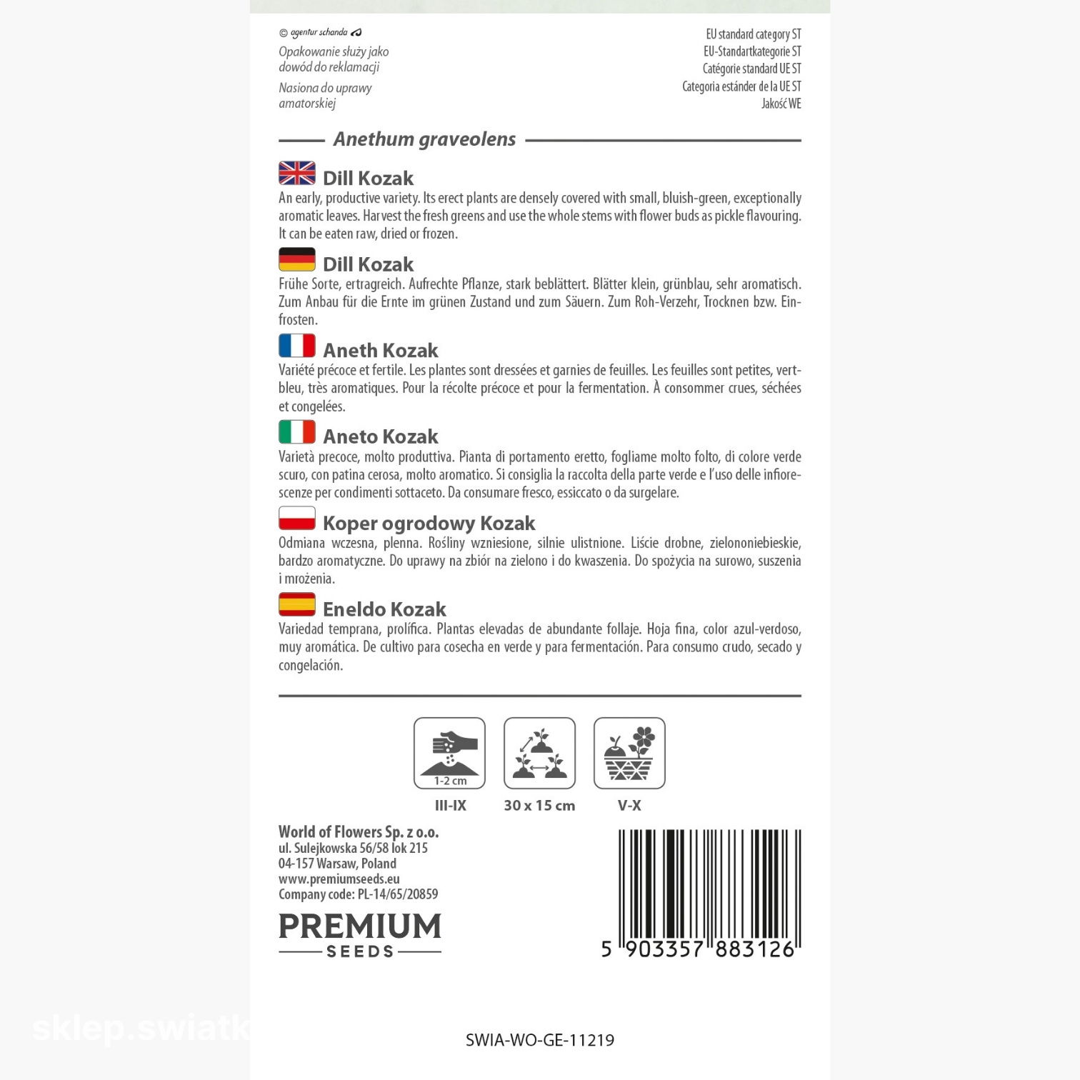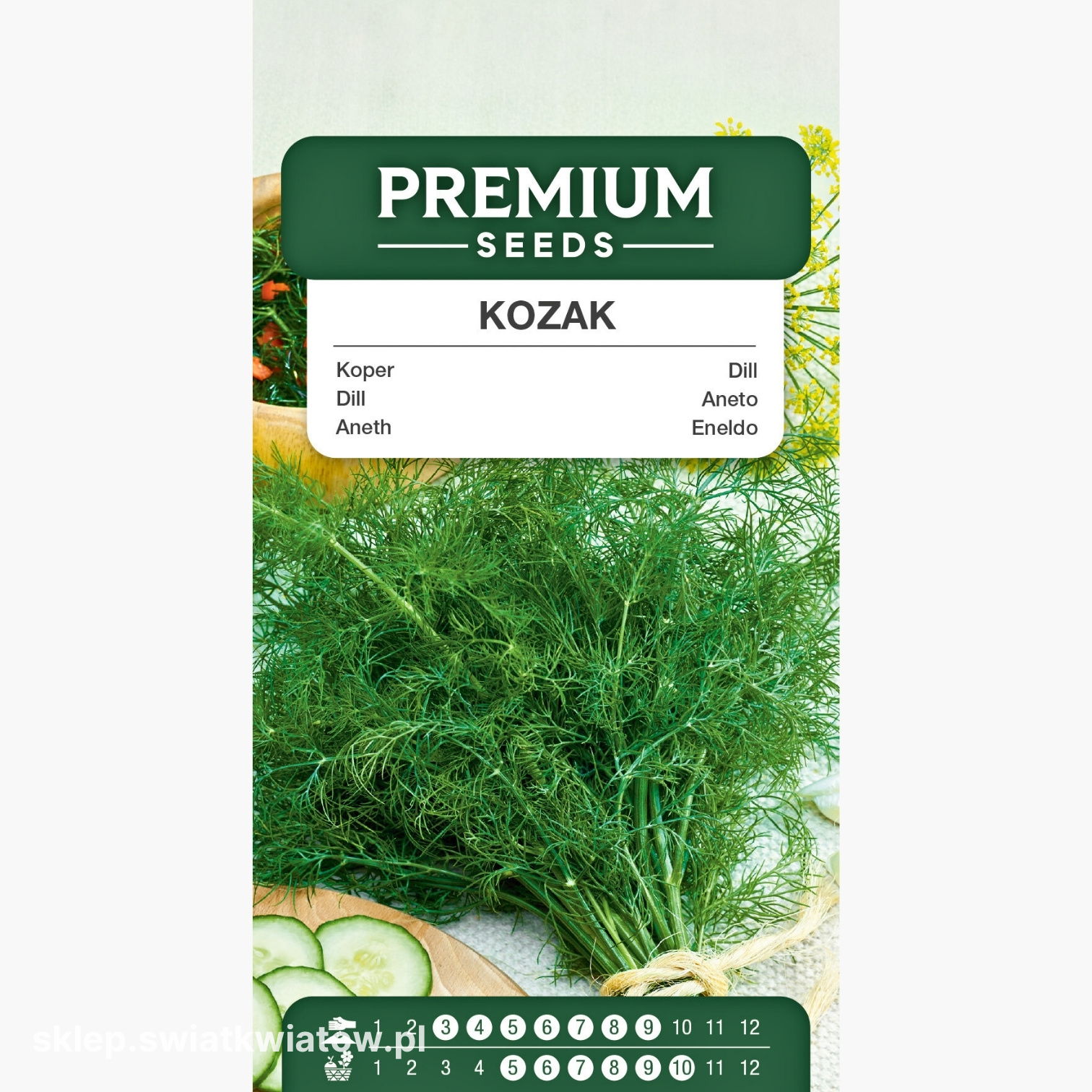 Koper ogrodowy Kozak to wczesna i plenna odmiana ceniona za intensywny aromat i szerokie zastosowanie kulinarne. Tworzy silnie ulistnione, wzniesione pędy z drobnymi liśćmi o zielononiebieskim odcieniu i wyrazistym smaku. Doskonale sprawdza się w sałatkach, zupach, sosach i daniach mięsnych. Może być uprawiany na zbiór na zielono, do kwaszenia, a także do suszenia i mrożenia, dzięki czemu zachowuje swoje walory smakowe na dłużej.