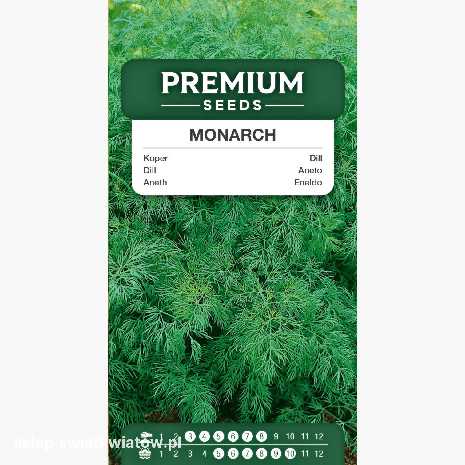 Koper ogrodowy Monarch to ceniona odmiana, która świetnie sprawdza się w uprawie na zieloną natkę. Roślina intensywnie się krzewi, tworząc bujne, ciemnozielone liście z delikatnym, niebieskawym nalotem. Aromatyczne liscie doskonale wzbogacają smak sałatek, zup i sosów. Monarch wyróżnia się odpornością na przedwczesne wybijanie w pędy kwiatostanowe, dzięki czemu można korzystać z jego liści przez długi czas. Co więcej, po ścięciu szybko odrasta, co czyni go wyjątkowo praktycznym i niezawodnym wyborem do ogrodu.
