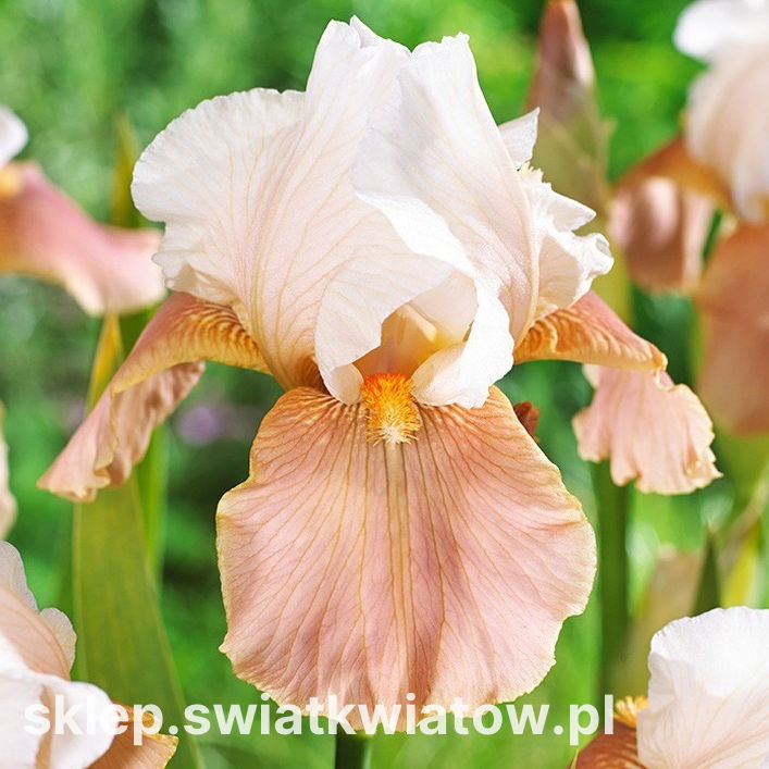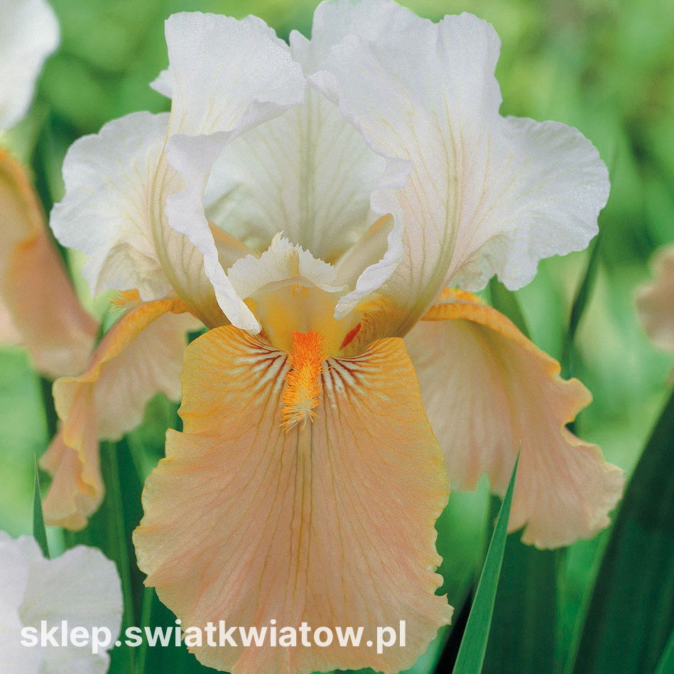 Kosaciec, Irys – biało-łososiowy – Festive Skirt (Iris germanica) zdobędzie uznanie miłośników pastelowych barw. Jego duże kwiaty, zbudowane z sześciu płatków okwiatu, mają prześliczne kolory: płatki skierowane w dół są łososiowe, te wzniesione do góry zaś – białe z delikatnym, brzoskwiniowym żyłkowaniem. Pąki prezentowanej byliny otwierają się w czerwcu, a jej piękno można podziwiać w pełnej krasie przez całe lato, aż do września. Dodatkowym walorem dekoracyjnym irysa Festive Skirt są jego wąskie, wzniesione liście, rozwijające się w bujnej kępie poniżej kwiatów. Na ciemnozielonym tle subtelne kolory płatków wyglądają jeszcze żywiej i ładniej.