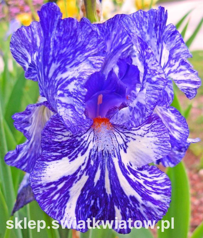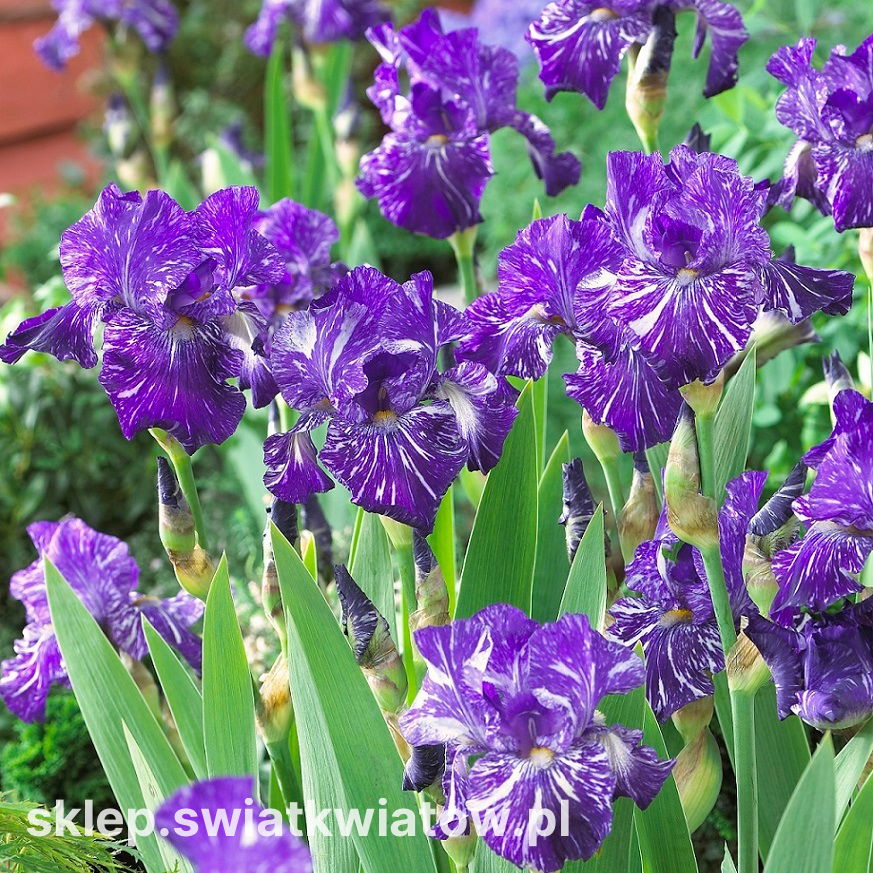 Kosaciec, Irys – fioletowy z białym nakrapianiem – Batik (Iris germanica) to urzekająca odmiana znanego i lubianego kosaćca kłączowego, kwitnącego obficie na przełomie wiosny i lata. Oferowana bylina dorasta do 45-70 cm wysokości, w zależności od rodzaju gleby, a jej proste, gładkie pędy są otoczone szeroką kępą równowąskich, szmaragdowozielonych liści. W takiej pięknej, naturalnej ramie rozwijają się kwiaty – duże, asymetryczne, o białych płatkach pokrytych niesamowitą mozaiką fioletowych plam i prążków. Irys bródkowy Batik stanowi doskonałą propozycję na słoneczne bądź lekko zacienione rabaty, wzniesione brzegi zbiorników wodnych i reprezentacyjne trawniki. Uprawia się go także na kwiaty cięty.
