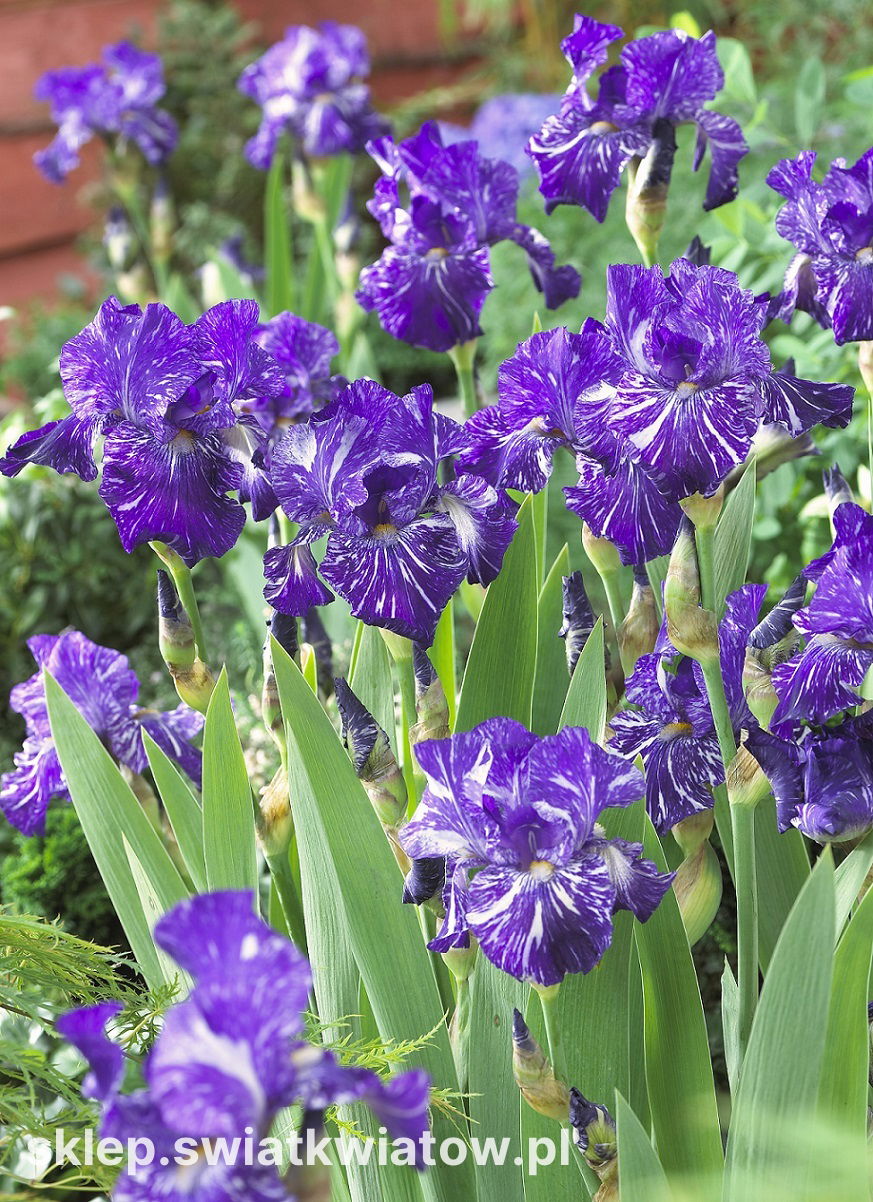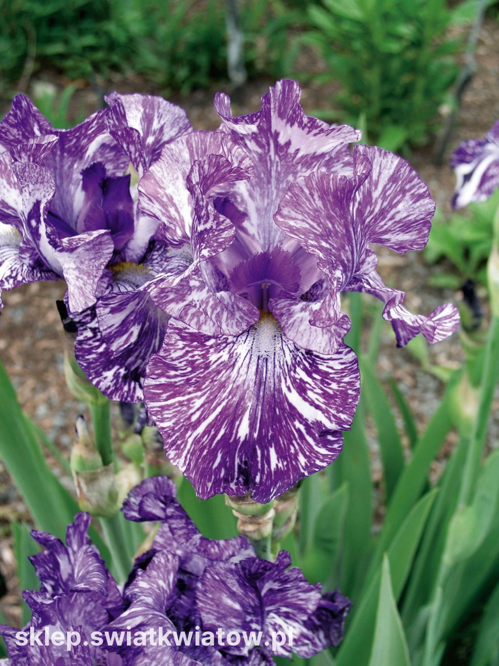 Kosaciec, Irys – fioletowy z białym nakrapianiem – Batik (Iris germanica) to urzekająca odmiana znanego i lubianego kosaćca kłączowego, kwitnącego obficie na przełomie wiosny i lata. Oferowana bylina dorasta do 45-70 cm wysokości, w zależności od rodzaju gleby, a jej proste, gładkie pędy są otoczone szeroką kępą równowąskich, szmaragdowozielonych liści. W takiej pięknej, naturalnej ramie rozwijają się kwiaty – duże, asymetryczne, o białych płatkach pokrytych niesamowitą mozaiką fioletowych plam i prążków. Irys bródkowy Batik stanowi doskonałą propozycję na słoneczne bądź lekko zacienione rabaty, wzniesione brzegi zbiorników wodnych i reprezentacyjne trawniki. Uprawia się go także na kwiaty cięty.