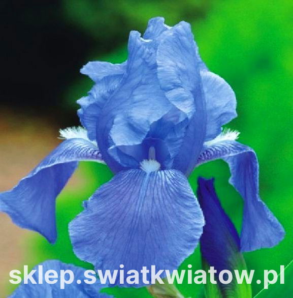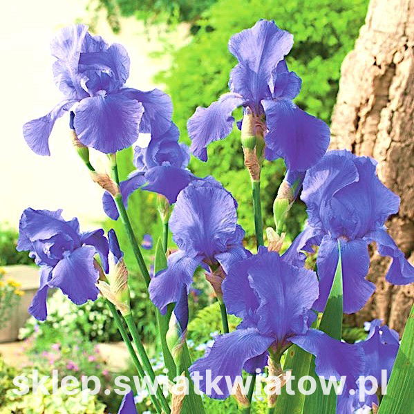 Kosaciec, Irys – Niebieski (Iris germanica) zalicza się do grona najwartościowszych odmian, polecanych zwłaszcza do uprawy w dużych grupach na reprezentacyjnych trawnikach i rabatach. Roślina osiąga pokaźne rozmiary, mierzy bowiem 70-80 cm, ale dzięki smukłym, wąskim, lancetowatym liściom i prostym łodygom zachowuje lekki pokrój. W czerwcu i lipcu jej strzeliste pędy dźwigają okazałe kwiaty cudownej urody, zbudowane z szerokich, atłasowych płatków barwy intensywnie niebieskiej: trzy dolne płatki spływają swobodnie w dół, a trzy górne są pionowo wzniesione.