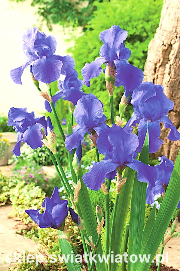 Kosaciec, Irys – Niebieski (Iris germanica) zalicza się do grona najwartościowszych odmian, polecanych zwłaszcza do uprawy w dużych grupach na reprezentacyjnych trawnikach i rabatach. Roślina osiąga pokaźne rozmiary, mierzy bowiem 70-80 cm, ale dzięki smukłym, wąskim, lancetowatym liściom i prostym łodygom zachowuje lekki pokrój. W czerwcu i lipcu jej strzeliste pędy dźwigają okazałe kwiaty cudownej urody, zbudowane z szerokich, atłasowych płatków barwy intensywnie niebieskiej: trzy dolne płatki spływają swobodnie w dół, a trzy górne są pionowo wzniesione.