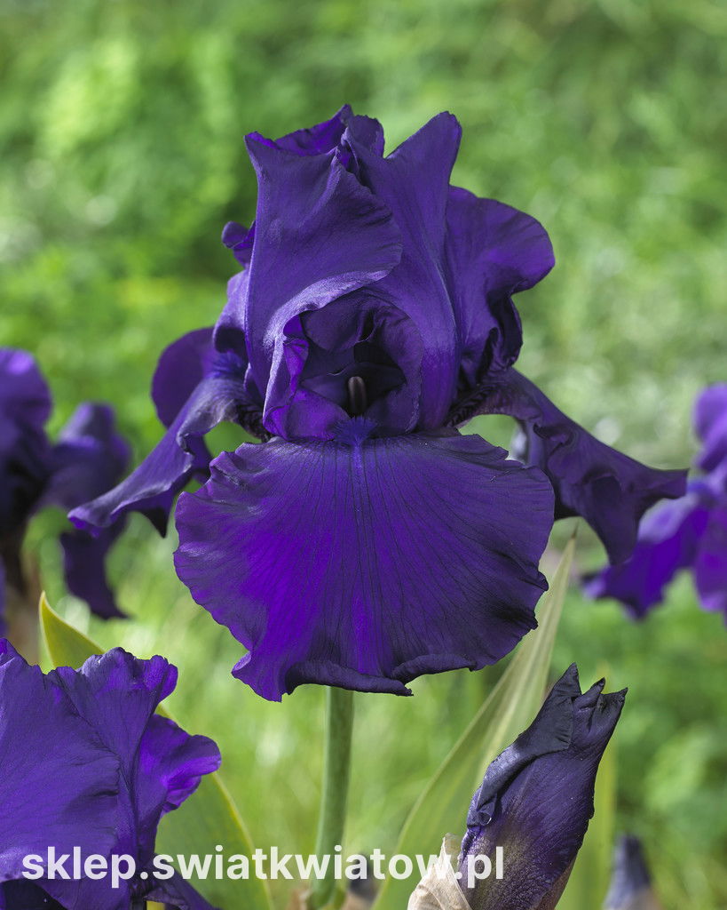 Kosaciec, Irys – Titan's Glory (Iris germanica) to jedna ze szczególnie cennych odmian irysa bródkowego, poszukiwana ze względu na zachwycający, nasycony kolor kwiatów. Prezentowana bylina zalicza się do wysokich, wręcz strzelistych. Sztywne, gładkie pędy kwiatowe kosaćca Titan’s Glory mierzą po 90 cm i są zwieńczone ogromnymi kwiatami, długimi nawet na 15 cm. Każdy kwiat składa się z sześciu szerokich, aksamitnych płatków o delikatnie karbowanej krawędzi – trzy z nich się wzniesione i połączone w kształt kopuły, trzy zwieszają się malowniczo ku ziemi. Ich ciemny, wyrazisty, fioletowoniebieski kolor sprawia, że oferowana odmiana przykuwa wzrok i wyróżnia się na tle jasnych kwiatów letnich.