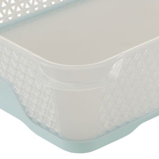 Koszyk z funkcją antypoślizgową – Jonas A5 – seledynowy to funkcjonalny i estetyczny pojemnik na drobne przedmioty, które chcesz mieć w jednym miejscu. Ażurowy koszyk z wytrzymałego tworzywa sztucznego pomieści wszystkie potrzebne Ci akcesoria biurowe i kuchenne, małe narzędzia, przybory do szycia, rysowania czy produkcji rękodzieła, klucze oraz pozostałe przedmioty codziennego użytku, które warto mieć pod ręką. Spód koszyka Jonas A5 został zabezpieczony matą gumową w przyjemnym dla oka kolorze seledynowym. Mata chroni pojemnik przed przesuwaniem się po powierzchni blatu, zmniejszając tym samym ryzyko przypadkowego strącenia koszyka na ziemię. Stonowane kolory produktu czynią z niego gustowny dodatek do wystroju każdego pomieszczenia.