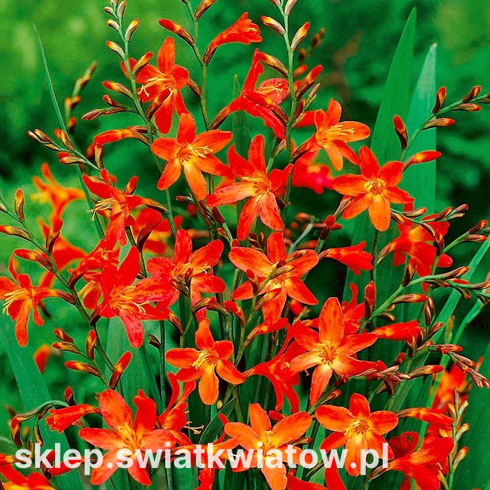 Krokosmia Carmine Brilliant – pomarańczowo-żółta – 500 szt. (Crocosmia x crocosmiiflora) to piękna cynobrówka o słonecznych kwiatach w ciepłych, żywych odcieniach oranżu i żółci. Proponowana w naszym sklepie odmiana jest prawdziwie uniwersalną ozdobą ogrodów i pojemników. Rośnie dość wysoka, ponieważ może osiągnąć do 100 cm, i wydaje proste, nagie, delikatne pędy, które w lipcu pokrywają się pąkami kwiatowymi. Lejkowate kwiaty o cieniutkich, zgrabnie odgiętych płatkach formują podwójne kłosy. Osadzone jeden nad drugim, otwierają się stopniowo, przedłużając kwitnienie krokosmii do wczesnej jesieni.