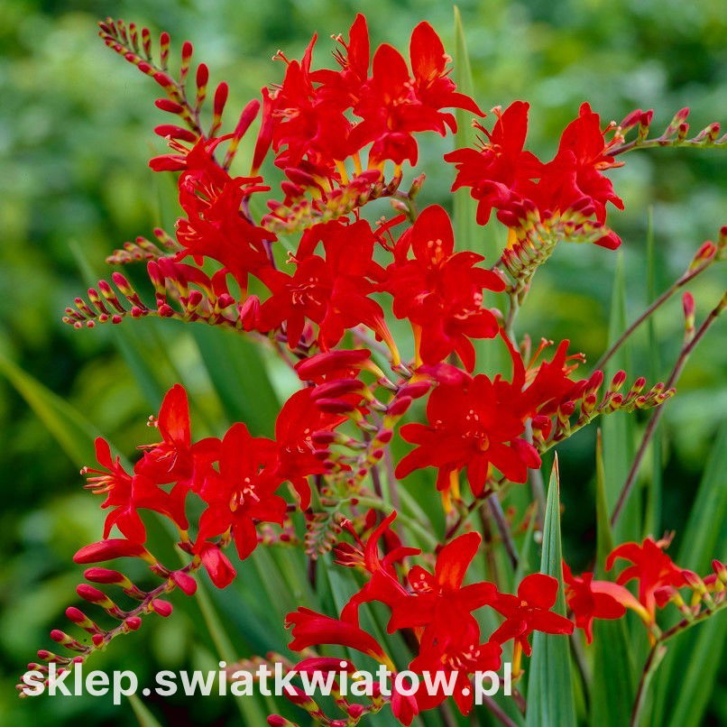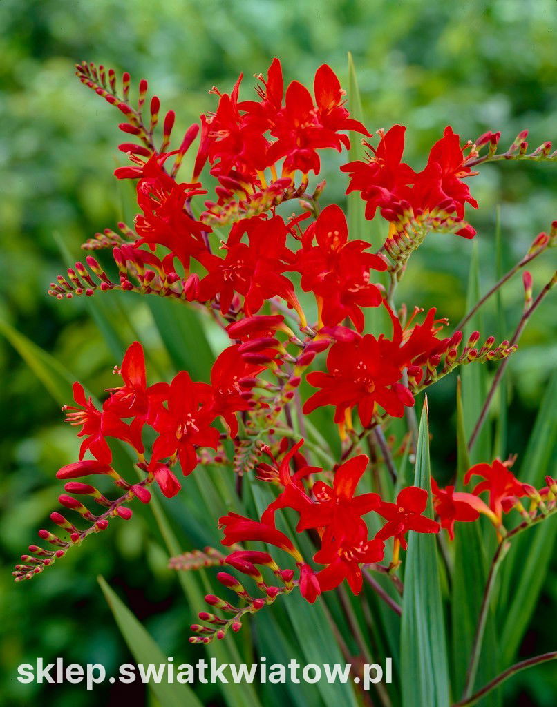Krokosmia Lucifer – ciemnoczerwona – 500 szt. (Crocosmia x crocosmiiflora) jest sprawdzoną, odporną i żywotną odmianą o długim okresie kwitnienia. Jej ponadprzeciętny wigor sprawia, że dorasta do 120 cm wysokości, co czyni z niej jedną z największych przedstawicielek gatunku. Krokosmia Lucifer wykazuje się szczodrym kwitnieniem, a jej kwiatostany nie mają sobie równych, jeśli chodzi o walory dekoracyjne. Długie, wyprostowane pędy kwiatowe, wybijające spomiędzy szablastych liści, są w pierwszej fazie kwitnienia pokryte rurkowatymi pąkami. W lipcu pąki stopniowo się otwierają, zaczynając od dołu łodyżki, a okazałe, lejkowate kwiaty o cieniutkich płatkach zachwycają egzotycznym urokiem. Oferowana w naszym sklepie odmiana kwitnie na ciemny, wyrazisty, wyjątkowo atrakcyjny czerwony kolor.