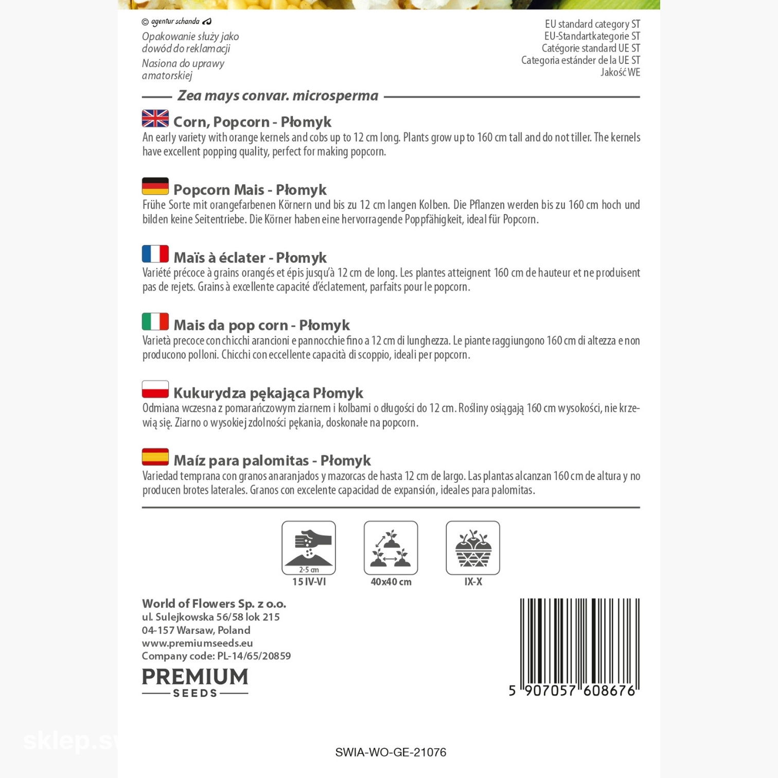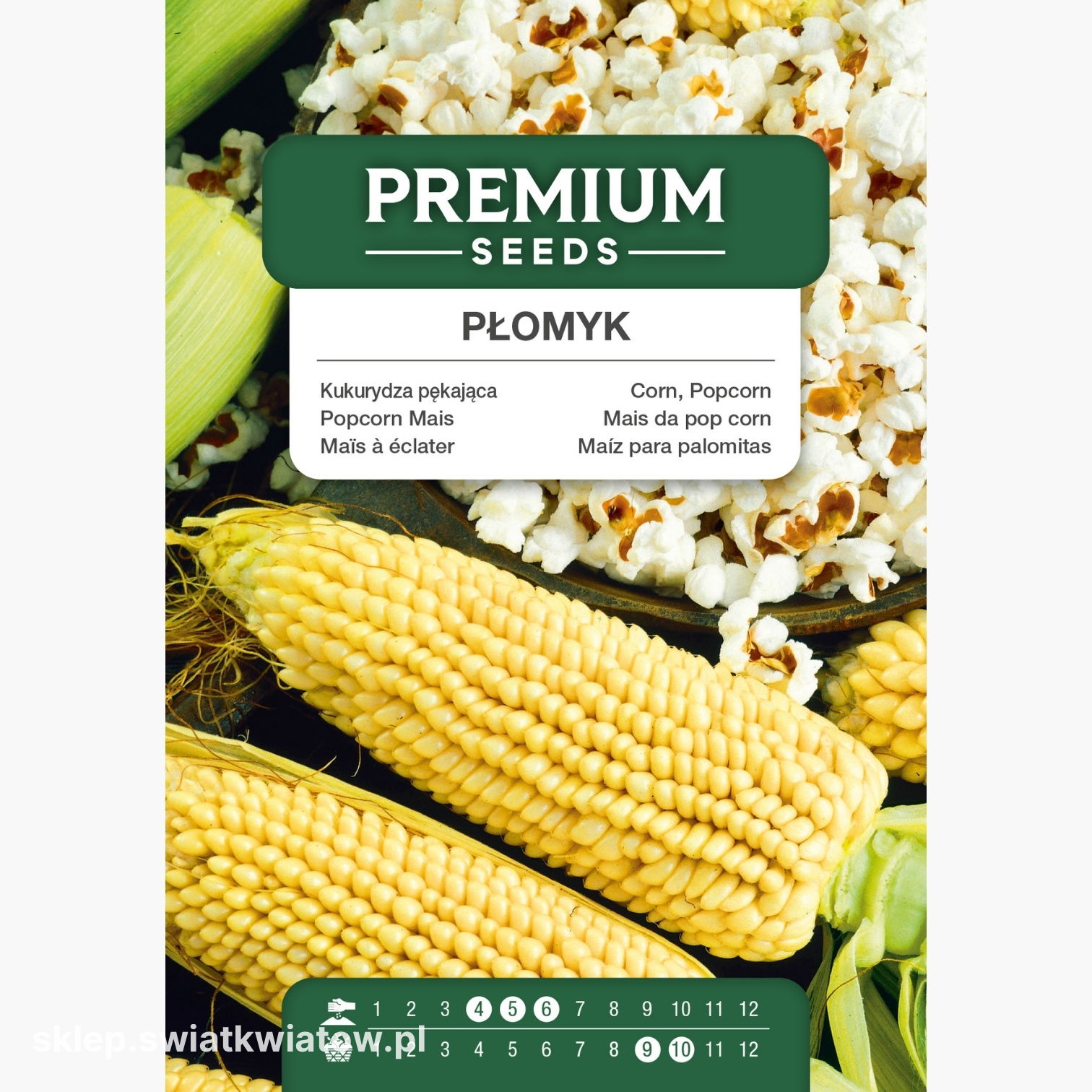 W każdej paczce znajduje się 20 g nasion kukurydzy pękającej Płomyk. Opakowanie zawiera informacje o zasadach uprawy oraz o terminie przydatności do siewu.