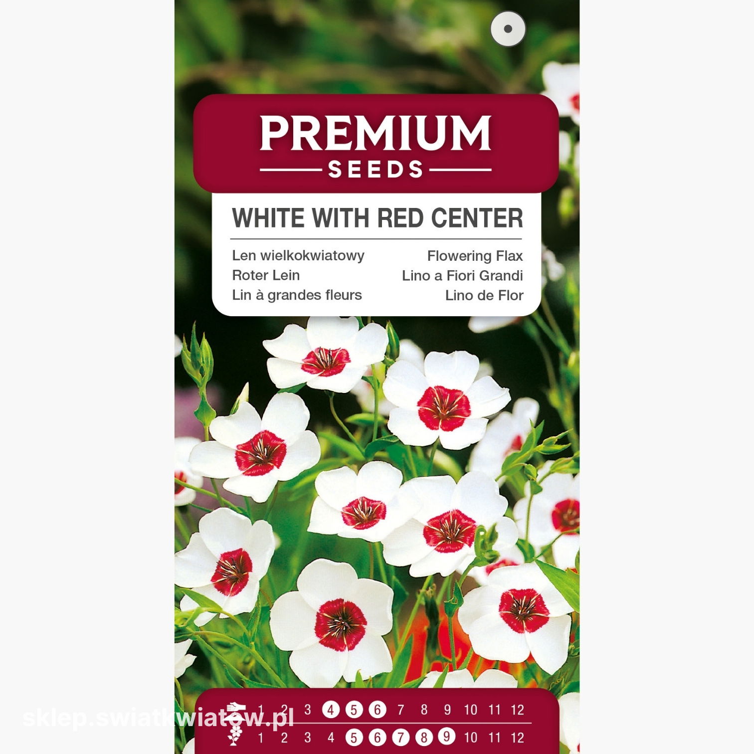 Len wielkokwiatowy biały z czerwonym oczkiem będzie wyjątkową ozdobą ogrodowej rabaty. Sięgające wysokości 35-40 cm łodygi, silnie się rozgałęziają. Pokryte przez lancetowate, szarozielone listki, początkowo wyprostowane pędy, pod ciężarem licznych kwiatów lekko się uginają. Na szycie każdego z nich pojawia się kwiatostan o luźnej budowie. Pojedynczy kwiat ma zazwyczaj 5 płatków i jest uczepiony długiej szypułki. Połyskujące satynowo kwiaty mają średnicę 3-5 cm, nie są zbyt trwałe, ale ich ilość w pełni to wynagradza. Każdego dnia rozwijają się kolejne kwiaty, od dołu do góry kwiatostanu, co zapewnia im dekoracyjny wygląd przez ponad miesiąc. Owocem są okrągłe torebki, które mają swoją wartość ozdobną. Len jest wspaniałym komponentem grup ogrodowych, rzędów kwiatowych. Polecany do zasiewania w okolicy skalniaków, murków i skarp. Sprawdza się na wrzosowiskach i w pojemnikach balkonowych. Okres kwitnienia przypada na początek czerwca i trwa do września.