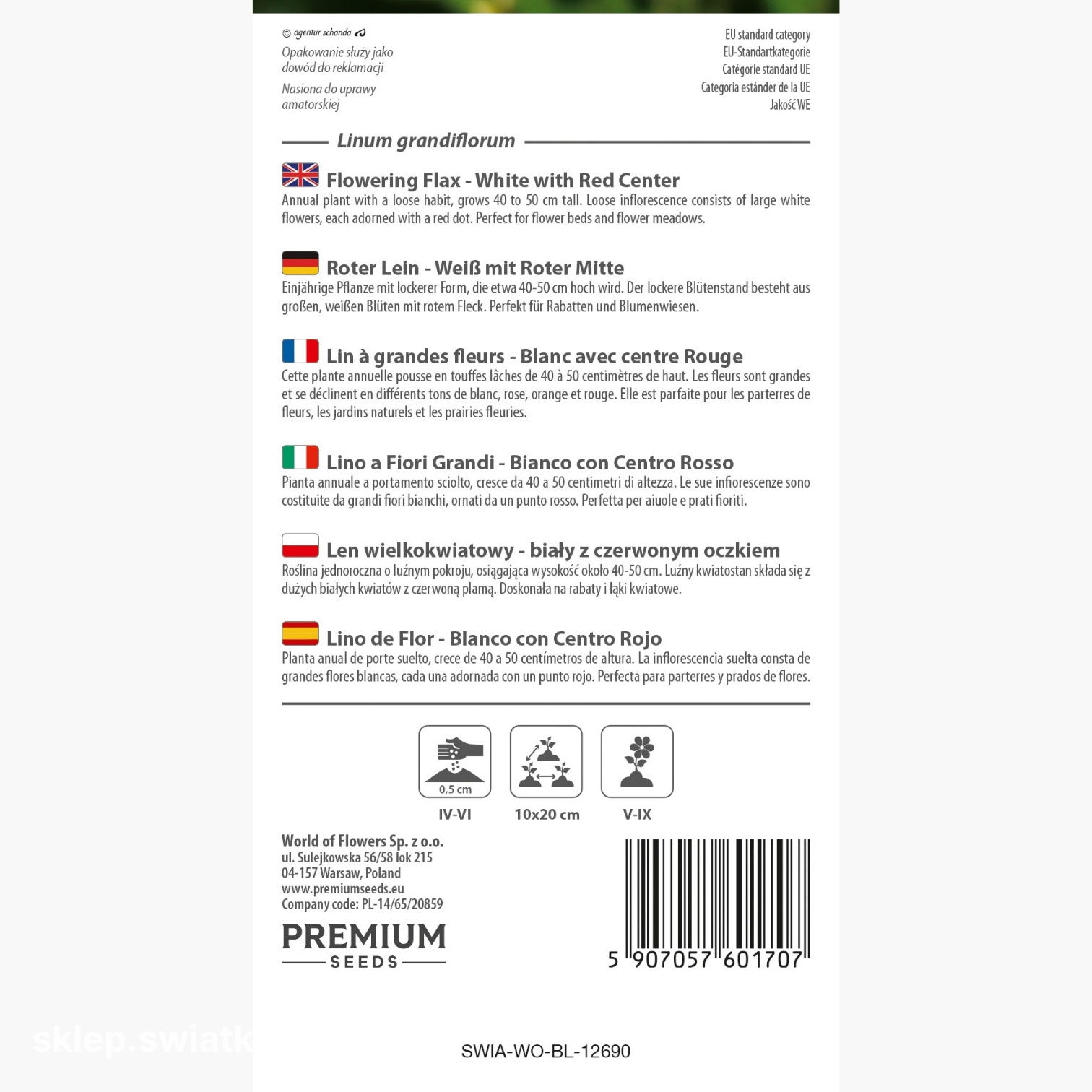 W opakowaniu znajduje 1 g nasion lnu wielkokwiatowego białego z czerwonym oczkiem. Na tyle paczki zostały zamieszczone podstawowe informacje o roślinie i jej uprawie.