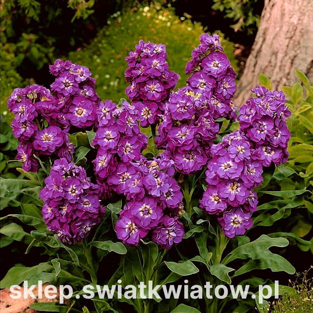 Lewkonia letnia Excelsior Purple Heart w oryginalnym, nasyconym, ciemnośliwkowym kolorze będzie unikatem ogrodu. Wzniesiona, sztywna łodyga jest pokryta dużymi, pełnymi lub pojedynczymi kwiatami w ilości od kilku do kilkunastu sztuk. Dorastająca do 50-80 cm wysokości, jest niezastąpiona królową rabaty o odurzającym zapachu. Jasnozielone liście pokryte nieco lepkim kutnerem są bardzo dobrą oprawą dla barwnych kwiatów. Lewkonia jest szeroko ceniona jako sezonowe uzupełnienie rabat bylinowych, kwietników i klombów. Jest niezawodna, po wsadzeniu do skrzynek i pojemników, staje się ich długotrwałą dekoracją, wyśmienicie współgrająca z innymi gatunkami roślin. Lewkonia letnia od lat jest wziętym kwiatem stosowanym w bukieciarstwie. Kolorowe i pachnące kompozycje wspaniale dekorują dom. W celu przedłużenia ich trwałości używa się kwiatów wraz z korzeniem. Okres kwitnienia zaczyna się już w czerwcu. Szczodrze obdarowane kwiatami rośliny zamierają dopiero jesienią.