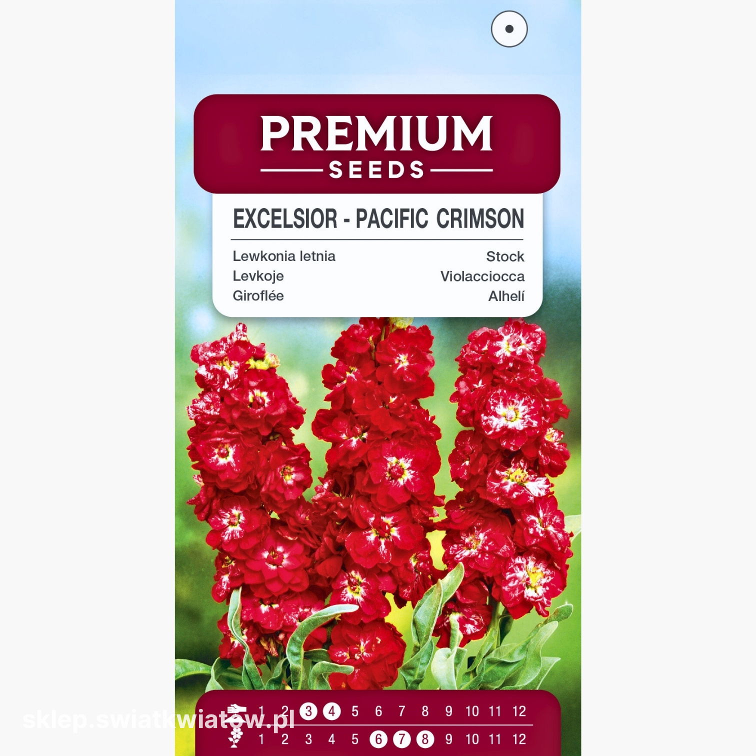 Lewkonia letnia Excelsior Pacific Crimson to wyjątkowa, jednoroczna roślina o eleganckim pokroju i intensywnie karminowych kwiatach, które przyciągają wzrok z daleka. Jej pachnące, pełne kwiatostany osadzone są na prostych, sztywnych łodygach osiągających do 70 cm wysokości. Ta odmiana zachwyca nie tylko barwą, ale i trwałością - ścięte kwiaty długo pozostają świeże, dlatego są chętnie wykorzystywane w bukietach i kompozycjach florystycznych. W ogrodzie lewkonia stanowi niezrównaną ozdobę rabat, wprowadzając nutę klasycznej elegancji i letniego uroku.