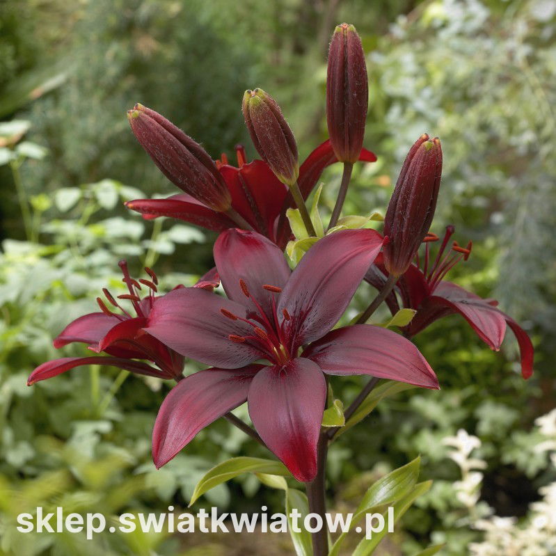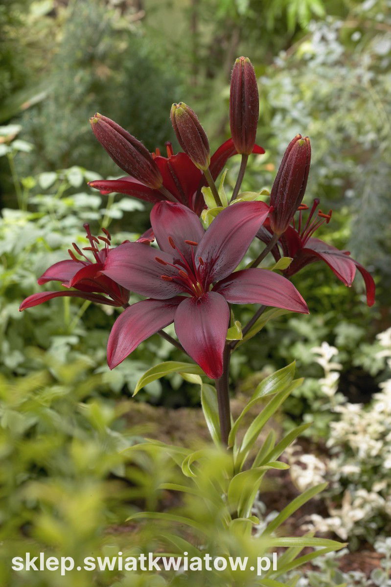 Bordowe kwiaty lilii azjatyckiej Bataleon stanowią wyrazisty akcent każdej aranżacji ogrodu. Ich błyszczące płatki, szerokie i efektowne, doskonale prezentują się zarówno wśród klasycznych rabat, jak i w nowoczesnych kompozycjach na tle trawnika. Ciemnozielone liście kontrastują z intensywną barwą kwiatów, podkreślając ich dekoracyjny charakter w czasie kwitnienia. Wysokie, mocne pędy sprawiają, że ta odmiana lilii z łatwością staje się centralnym punktem letnich nasadzeń, przyciągając spojrzenia już od pierwszych dni czerwca.