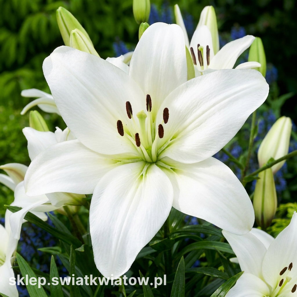 Lilia 'White' (Lilium) wyróżnia się klasyczną bielą i prostym pokrojem, doskonale wpisując się w różnorodne kompozycje ogrodowe. Roślina tworzy duże, jasne kwiaty z wyraźnie zaznaczonym środkiem oraz kontrastującymi pręcikami. Lekko zielonkawy odcień pąków stopniowo przybiera czystą biel podczas rozwijania się kielichów. Mocne, wyprostowane pędy wprowadzają na rabaty jasny i bardzo uporządkowany akcent.