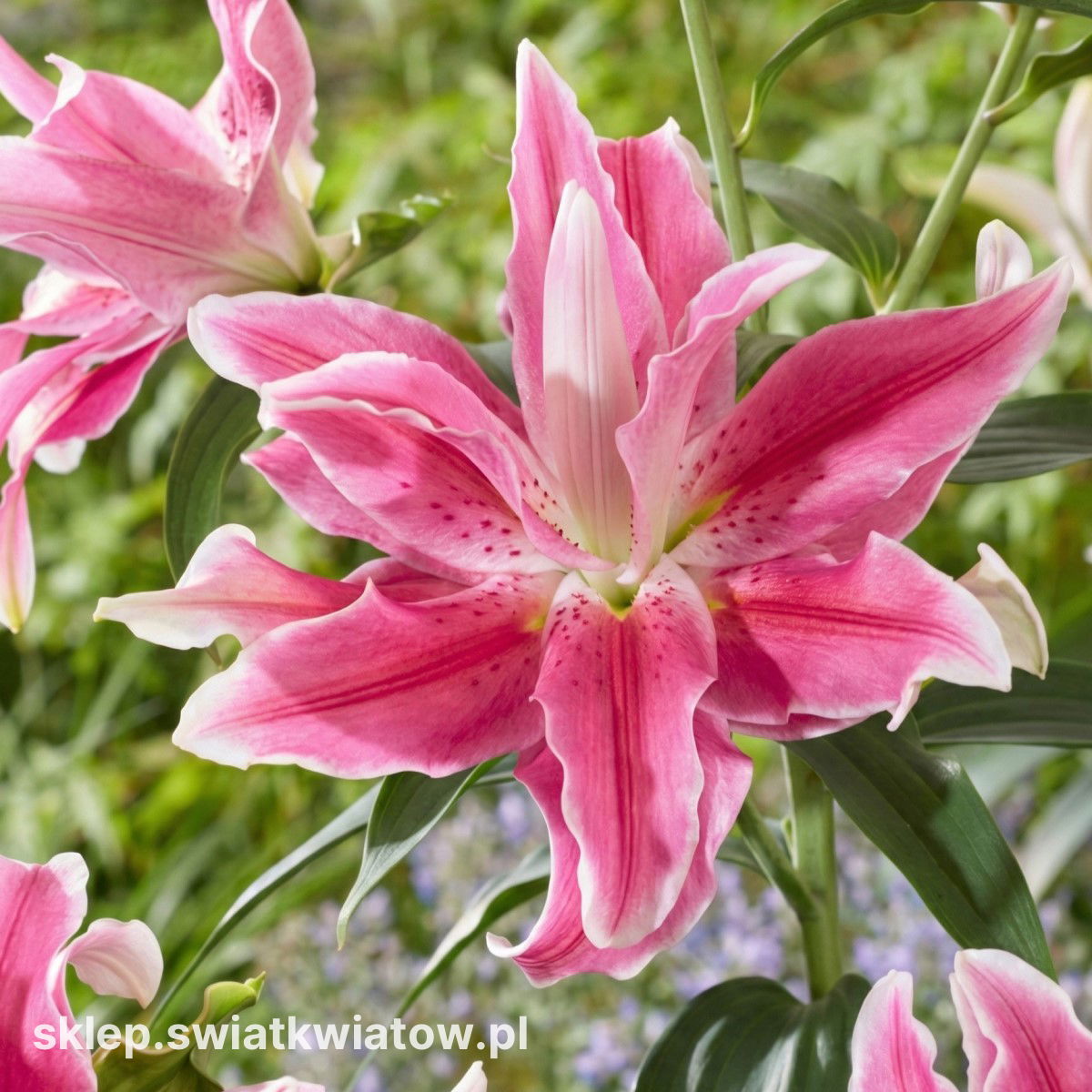 Lilia orientalna (Lilium) ‘Lila Cloud’ to wyjątkowo efektowna odmiana łącząca romantyczny charakter z nowoczesną formą kwiatów. Należy do grupy lilii pełnych i wyróżnia się wielowarstwowymi kwiatami pozbawionymi pylników. Płatki mają delikatny, cukierkowo-różowy odcień, często z jasnym rozjaśnieniem na brzegach oraz subtelną, ciemniejszą pręgą wzdłuż środka. Kwiaty zachwycają nie tylko wyglądem, ale także intensywnym, słodkim zapachem typowym dla lilii orientalnych. Silne, wyprostowane pędy doskonale eksponują okazałe kwiatostany, czyniąc odmianę ‘Lila Cloud’ wyrazistą ozdobą letnich rabat i kompozycji ogrodowych.