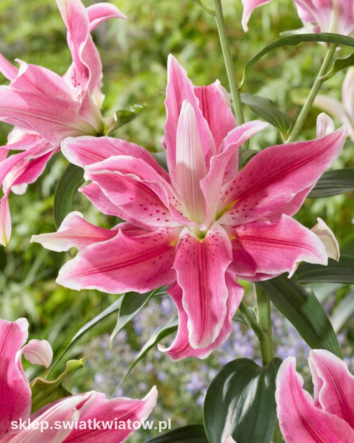 Lilia orientalna (Lilium) ‘Lila Cloud’ to wyjątkowo efektowna odmiana łącząca romantyczny charakter z nowoczesną formą kwiatów. Należy do grupy lilii pełnych i wyróżnia się wielowarstwowymi kwiatami pozbawionymi pylników. Płatki mają delikatny, cukierkowo-różowy odcień, często z jasnym rozjaśnieniem na brzegach oraz subtelną, ciemniejszą pręgą wzdłuż środka. Kwiaty zachwycają nie tylko wyglądem, ale także intensywnym, słodkim zapachem typowym dla lilii orientalnych. Silne, wyprostowane pędy doskonale eksponują okazałe kwiatostany, czyniąc odmianę ‘Lila Cloud’ wyrazistą ozdobą letnich rabat i kompozycji ogrodowych.