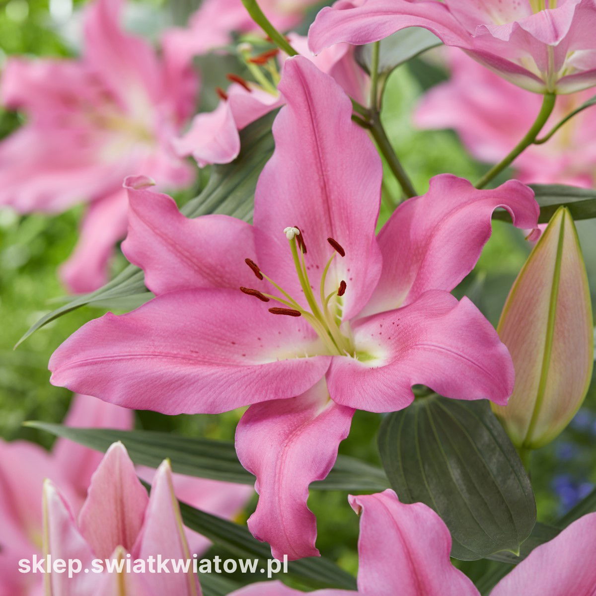 Lilia orientalna (Lilium) 'Praiano' to efektowna odmiana, która przyciąga uwagę dużymi, szeroko otwartymi kwiatami i intensywnym zapachem. Kwiaty o czystej, różowej barwie są skierowane ku górze i na zewnątrz, dzięki czemu są doskonale wyeksponowane i widoczne z daleka. Na jednej, mocnej łodydze rozwija się nawet kilka pąków, co daje imponujący efekt w czasie kwitnienia. 'Praiano' to lilia, która nadaje rabatom wyrazisty, elegancki charakter i świetnie sprawdza się jako centralny punkt letnich kompozycji ogrodowych.