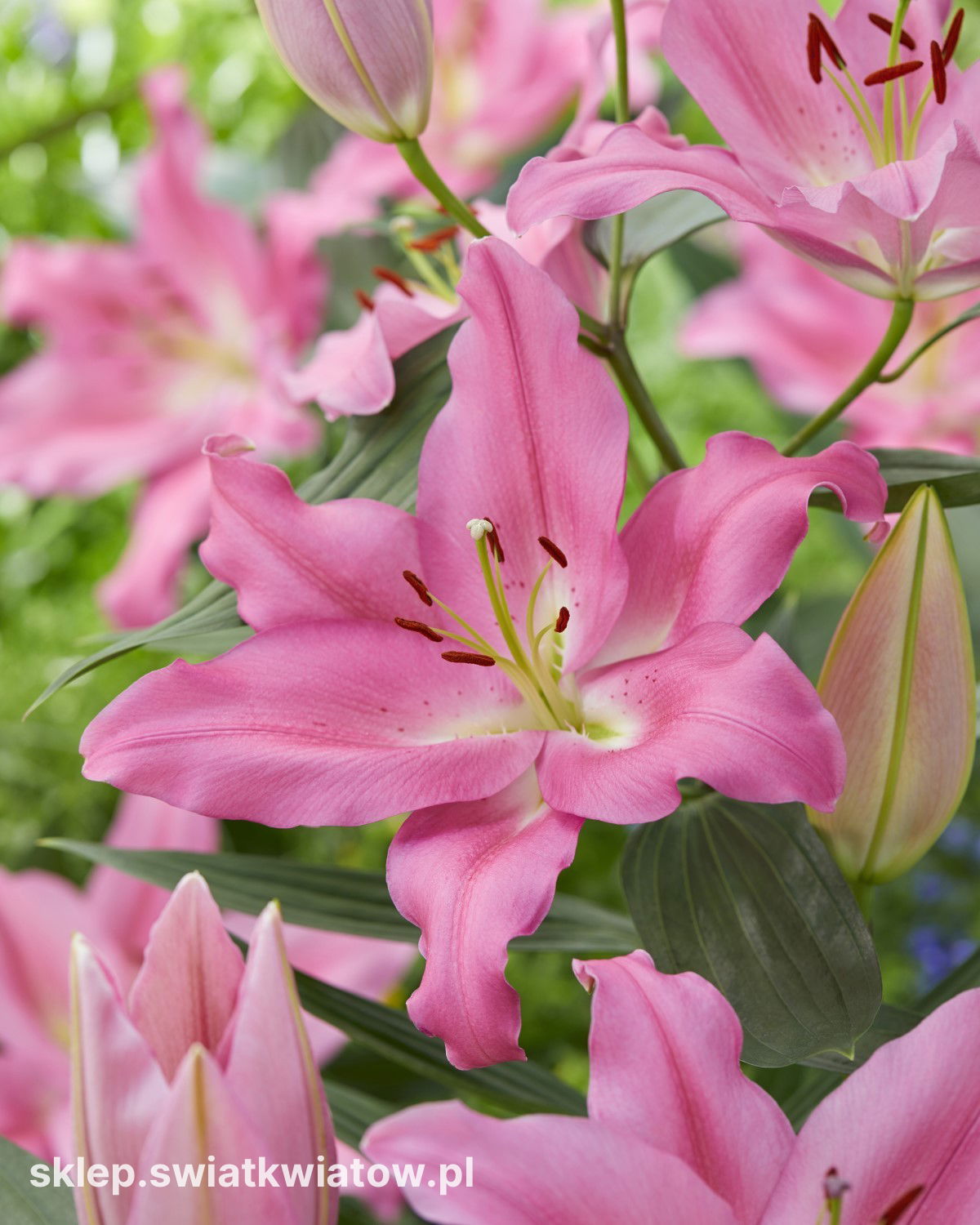 Lilia orientalna (Lilium) 'Praiano' to efektowna odmiana, która przyciąga uwagę dużymi, szeroko otwartymi kwiatami i intensywnym zapachem. Kwiaty o czystej, różowej barwie są skierowane ku górze i na zewnątrz, dzięki czemu są doskonale wyeksponowane i widoczne z daleka. Na jednej, mocnej łodydze rozwija się nawet kilka pąków, co daje imponujący efekt w czasie kwitnienia. 'Praiano' to lilia, która nadaje rabatom wyrazisty, elegancki charakter i świetnie sprawdza się jako centralny punkt letnich kompozycji ogrodowych.