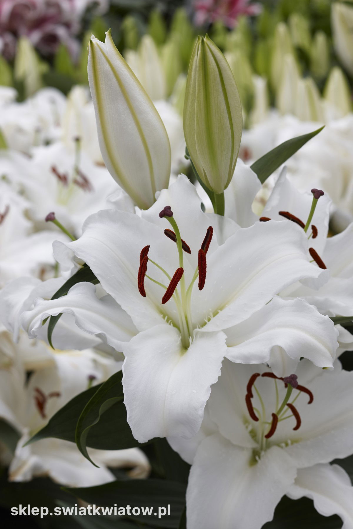 Lilia orientalna (Lilium) 'White Balloons' to wyjątkowo efektowna odmiana, która zachwyca nieskazitelną bielą kwiatów i intensywnym, orientalnym zapachem. Jej duże, śnieżnobiałe kwiaty o szerokich, mięsistych płatkach tworzą wyrazisty kontrast z ciemnymi, rdzawymi pylnikami, nadając całości szlachetny charakter. W czasie kwitnienia roślina roztacza wokół siebie słodki aromat, szczególnie wyczuwalny w letnie wieczory. Silne, wyprostowane pędy efektownie eksponują okazałe kwiatostany, czyniąc lilię 'White Balloons' elegancką ozdobą rabat i reprezentacyjnych nasadzeń ogrodowych.