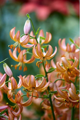 Lilia złotogłów Fairy Morning oczaruje wszystkich niebanalną urodą. Wygląda niezwykle ciekawie zarówno w ogrodowej scenerii, jak i w stylowym bukiecie. Przechodzące od pomarańczu do różu, nakrapiane kwiaty o mocno zawiniętych do góry płatkach prezentują się bajecznie. Rozwijająca przeciętnie 20-30 pąków na jednym pędzie lilia Fairy Morning jest bardzo atrakcyjna jako roślina na mieszane kompozycje i do tworzenia zjawiskowych, naturalistycznych zakątków. Uwielbiana przez motyle i pszczoły lilia złotogłów kwitnie od początku czerwca. Wysokie na 120-150 cm rośliny ze szczytowymi, bujnymi kwiatostanami rozsiewają przyjemny, dobrze wyczuwalny zapach. Lilie z tej grupy świetnie pasują do kwietników z różami, hostami i innymi odmianami lilii. Aby efekt dekoracyjny był jak największy, zalecane jest sadzenie grupami, minimum 3-5 sztuk.