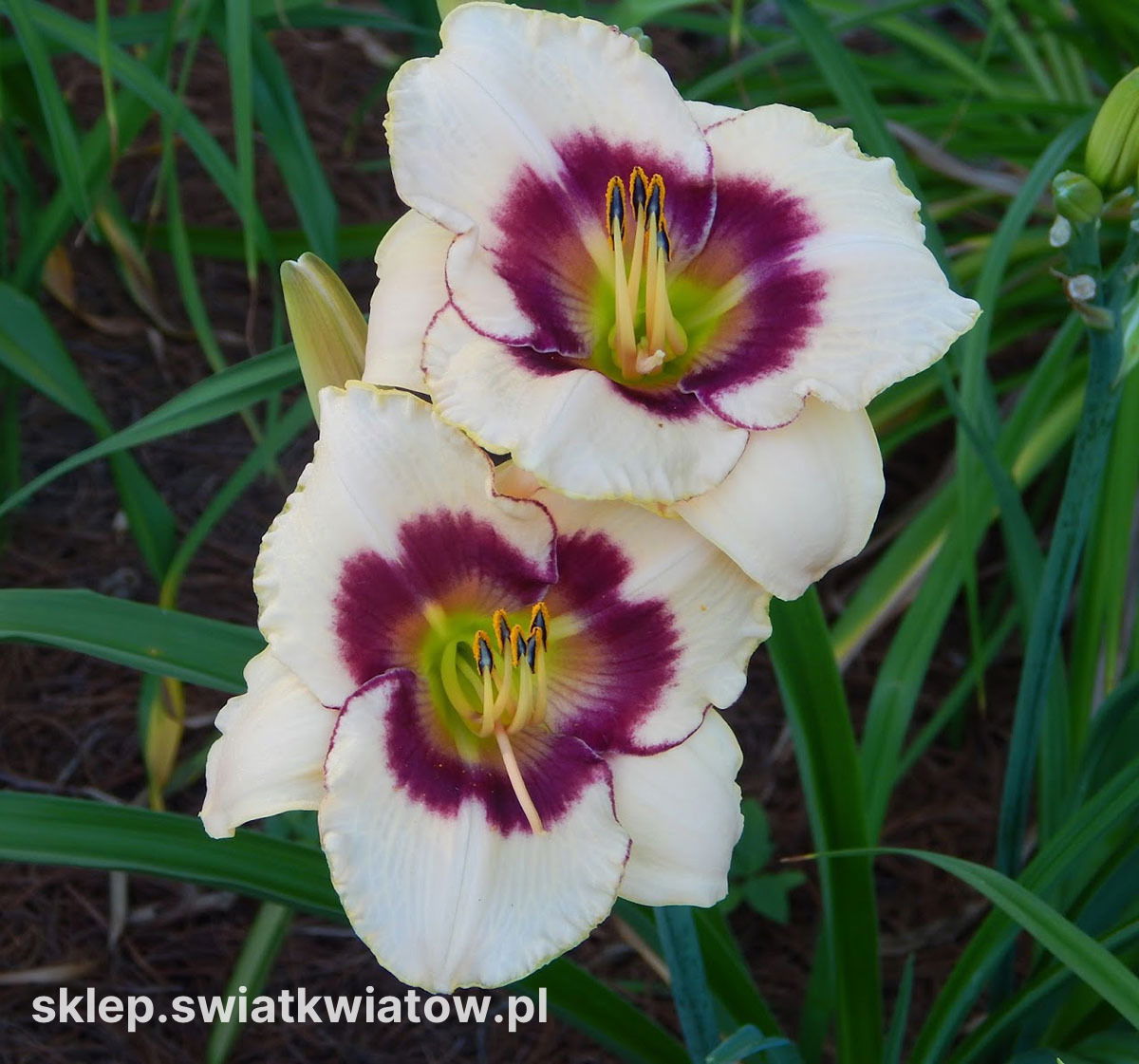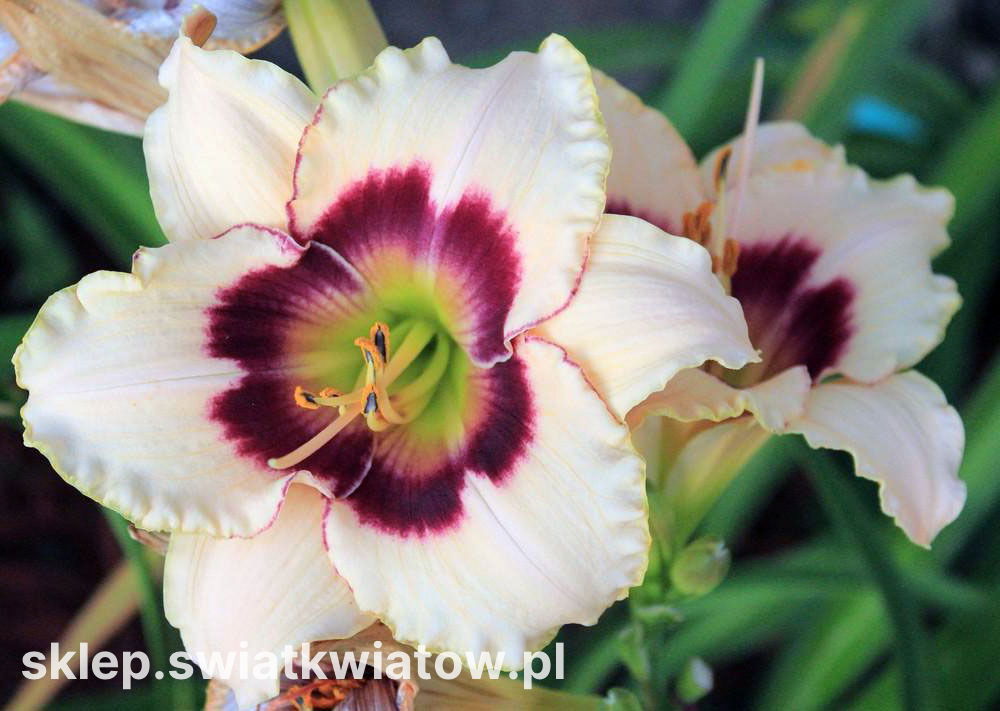 Liliowiec Blueberry Candy (Hemerocallis) uchodzi za jedną z najładniejszych odmian, dostępnych obecnie w sprzedaży. Jego uroda wynika przede wszystkim z kontrastowego, a zarazem wdzięcznie skomponowanego zestawienia kolorów: duże płatki, ułożone w szeroko otwartą miseczkę, mają barwę kremową z różowym odcieniem, a w centrum kwiatu znajduje się rozległa, bordowa plama. Jeden okaz wytwarza bardzo liczne kwiaty, które przez całe lato wznoszą się na smukłych pędach w obramowaniu obfitej kępy równowąskich, ciemnozielonych liści.