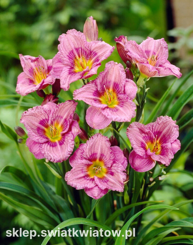 Liliowiec Siloam New Toy to dzieło hodowców o oryginalnym kolorze kwiatów. Wydawane przez roślinę kielichy są w liliowo-różowej tonacji z ciemniejszymi żyłkami. Ciemniejsze fioletowe oko, rozlewa się na jaśniejszym tle, a zielone gardziel nadaje kwiatom przyjemnej dla oka głębi. Kolory płynnie przechodzą jeden w drugi, niczym malowane akwarelą. Prosty w uprawie i obficie kwitnący liliowiec ma jeszcze jeden element dekoracyjny – brzegi jego płatków są pokryte delikatnym falowaniem. Rosnący do 45 cm wydaje w ciągu jednego sezonu do 150 pachnących kwiatów. Szczyt kwitnienia przypada na lipiec. Letnia rabata ustrojona w efektowne kwiaty robi niesamowite wrażenie. Niewysokie rośliny oferowanej odmiany doskonale sprawdzają w donicach i skrzyniach, które w momencie kwitnienia możemy ulokować w dowolny miejscu na posesji. Liliowiec Siloam New Toy jest świetny jako wypełnienie luk w niższych partiach kompozycji, idealnie pasuje przy brzegu ogrodowej sadzawki. Posadzony grupowo lub w gęstym rzędzie zdobędzie sympatię wielu posiadaczy zielonego terenu.
