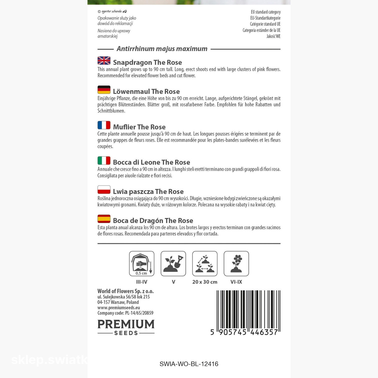 Lwia paszcza wysoka różowa The Rose (Antirrhinum majus) to jednoroczna roślina ozdobna, która dorasta do 90 cm wysokości i tworzy mocne, wzniesione pędy zakończone gęstymi gronami dużych, dwuwargowych kwiatów. Ich intensywnie różowa barwa w połączeniu z charakterystyczną, żółtą gardzielą nadaje kwiatostanom wyrazisty i elegancki wygląd. Roślina długo zachowuje walory dekoracyjne i świetnie prezentuje się zarówno na rabatach, jak i w formie bukietów. Dzięki zwartej formie i atrakcyjnej kolorystyce świetnie sprawdza się jako element kompozycji ogrodowych i tarasowych.