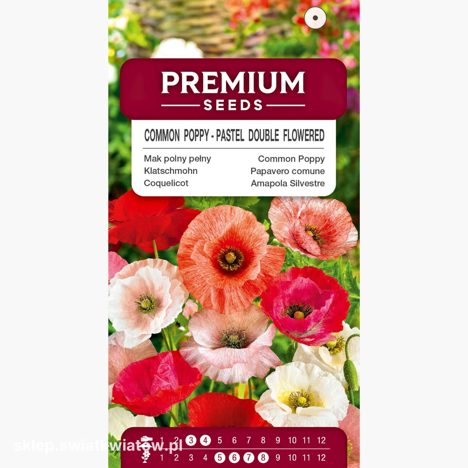 Mak polny pełny - mieszanka w pastelowych odcieniach(Papaver rhoeas) stanowi gotowy pomysł na przyjemną dla oka i łatwą w utrzymaniu kompozycję kwietnikową. Jednoroczny mak polny, który znakomicie udaje się z siewu zarówno jesiennego, jak i wiosennego, to żywotny, bezproblemowy w uprawie gatunek o dużych, pięknych kwiatach. Oferowana w naszym sklepie mieszanka zawiera nasiona odmian kwitnących na jasne odcienie różu, fioletu, czerwieni i żółci. Mogą znaleźć się w niej również kwiaty z domieszką bieli. Wysokie na 50-60 cm, delikatne z wyglądu maki polne dodadzą powabu klombom i rabatom. To znakomity wybór do ogrodu wiejskiego oraz na kwietną łączkę.