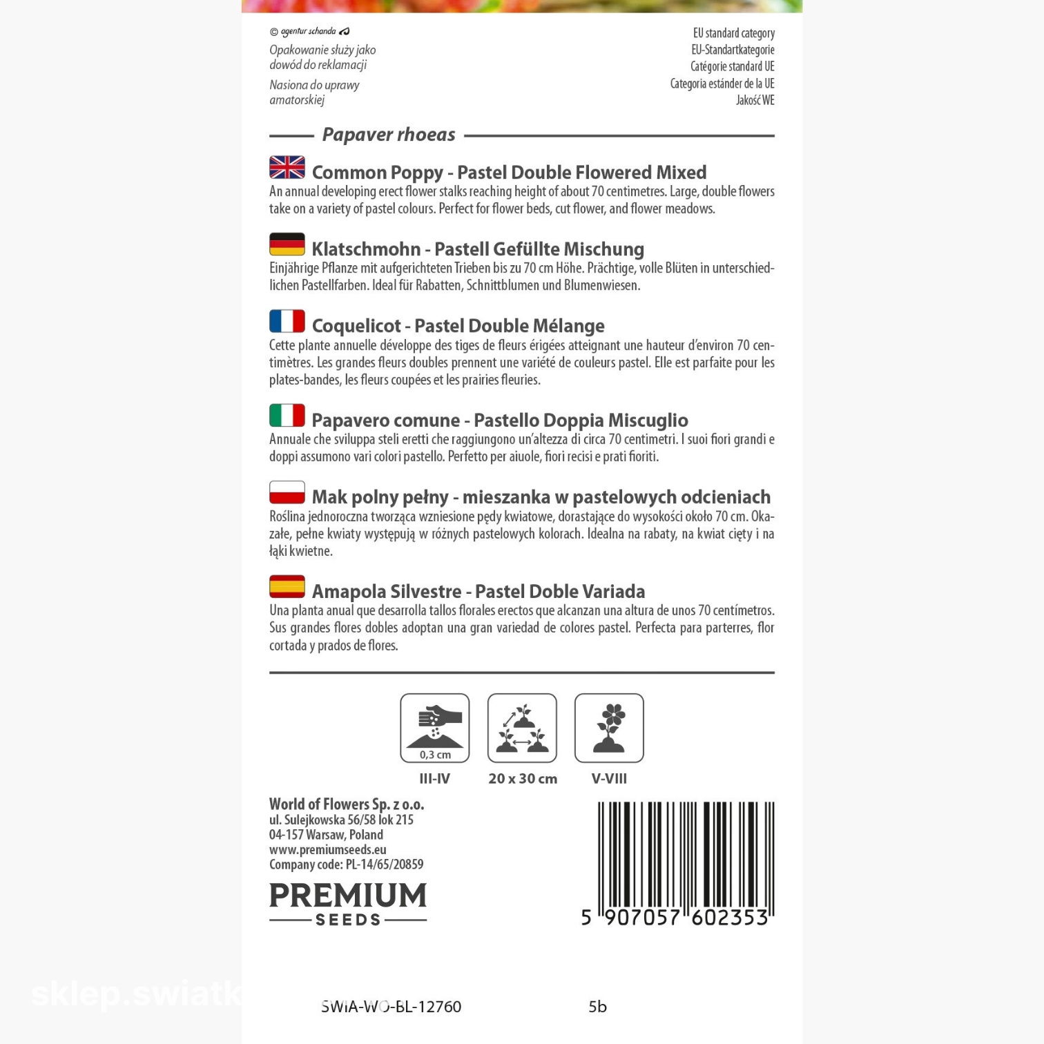 W każdej paczce znajduje się 0,1 g nasion maku polnego pełnego - mieszanka w pastelowych odcieniach. Opakowanie zawiera informacje o zasadach uprawy oraz o terminie przydatności do siewu.