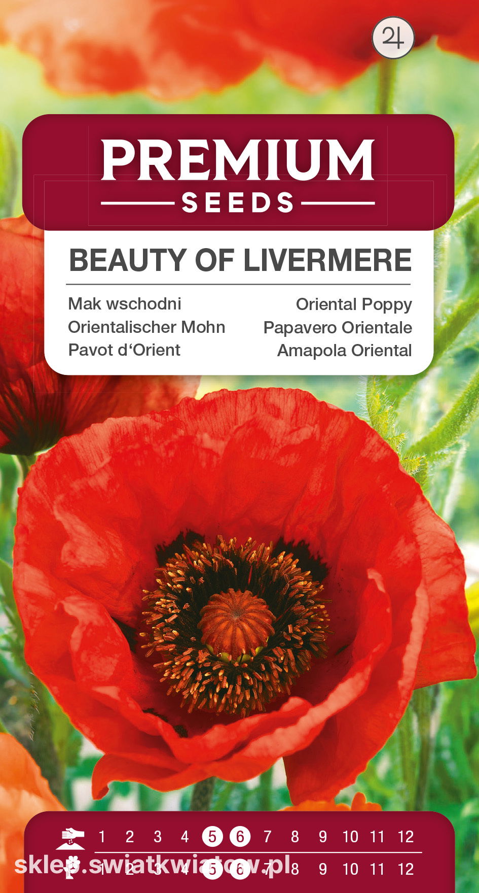 Mak wschodni Beauty of Livermere (Papaver orientale) zachwyca niezwykle dekoracyjnymi i okazałymi kwiatami, których średnica dochodzi do 15 cm. Rośliny w okresie kwitnienia dorastają do wysokości 100 cm. Postrzępione na brzegach, delikatne płatki mają intensywny czerwony kolor, który przepięknie kontrastuje z czarnym środkiem. Ta wieloletnia roślina, kwitnie już pod koniec wiosny. Kwiaty maku wschodniego Beauty of Liwer są bardzo atrakcyjne jednak dość nietrwałe, dlatego warto go sadzić w większej grupie by przez dłuższy czas cieszyć się ich obecnością w ogrodzie. Można je również ścinać do wazony, zanurzenie świeżo przyciętych łodyg w gorącej wodzie przedłuży ich trwałość.