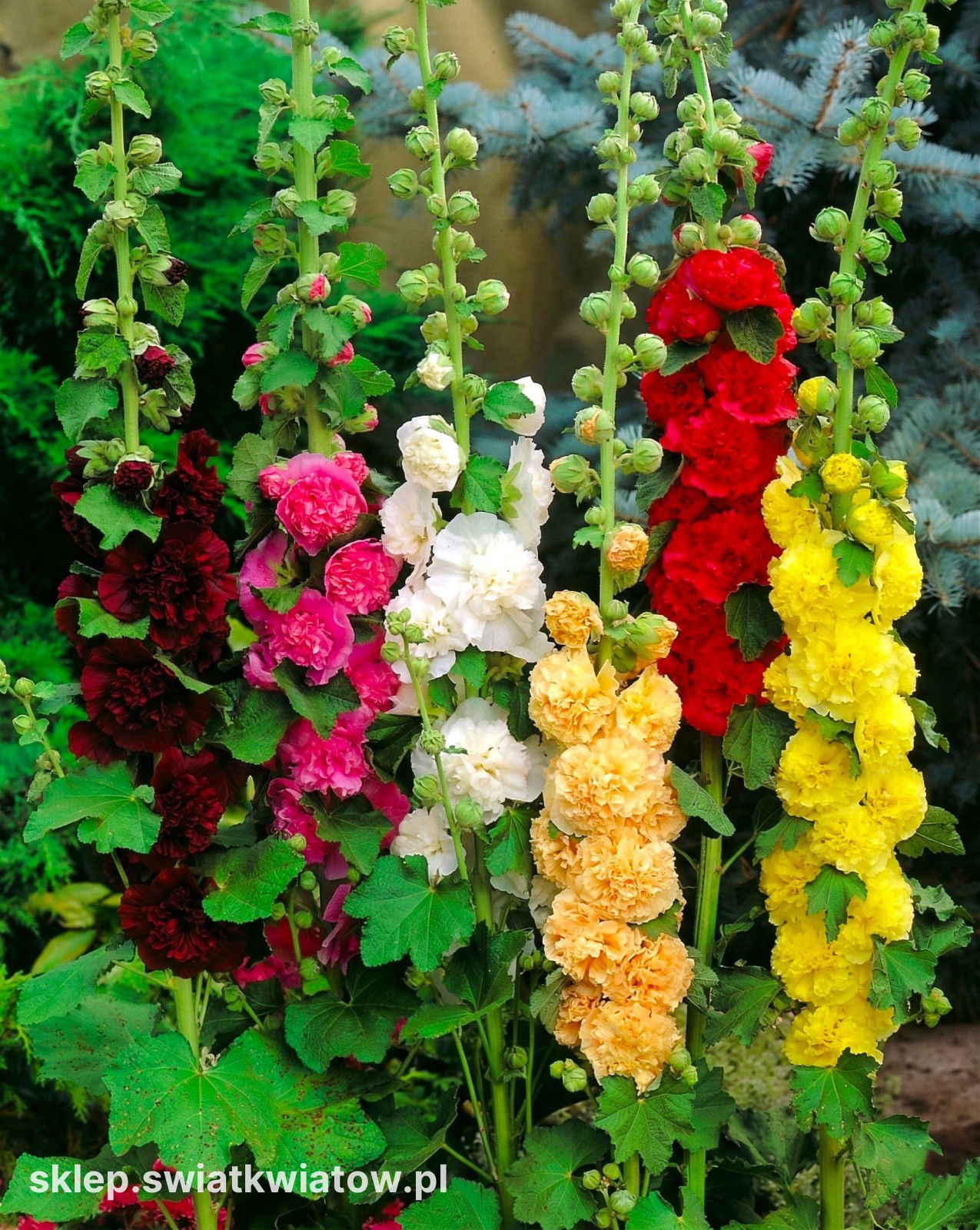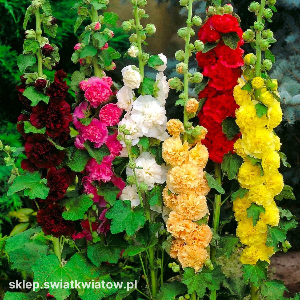 Mieszanka malw o różnych barwach pozwala stworzyć na rabacie swobodną, wielokolorową kompozycję. Na wysokich pędach rozwijają się duże, pełne kwiaty w odcieniach czerwieni, różu, bieli oraz jasnych tonach żółci. Kwiaty pojawiają się kolejno wzdłuż łodyg, dzięki czemu roślina przez długi czas pozostaje atrakcyjnym elementem ogrodu. Duże, zielone liście o wyraźnym unerwieniu stanowią naturalne tło dla barwnych kwiatów i podkreślają ich kolor.